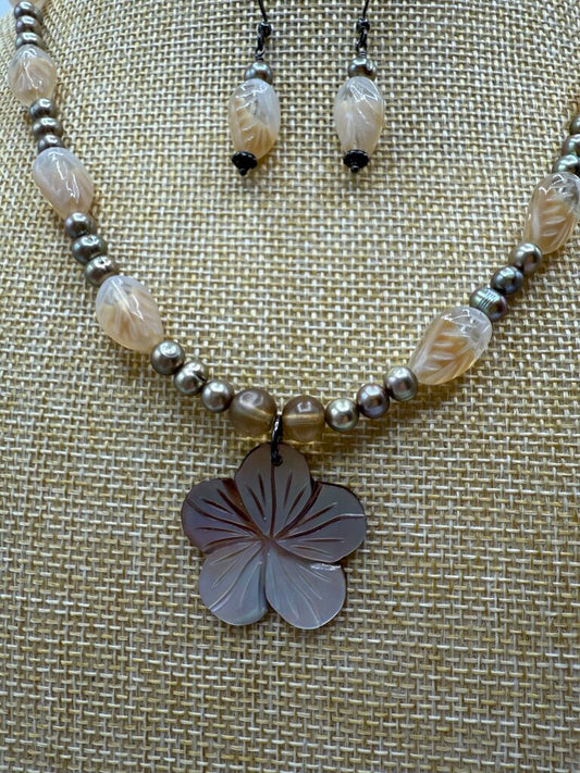 Beaded Necklace Fused Glass Pendant & Pierced Dangle Earrings Brown Tones /ro