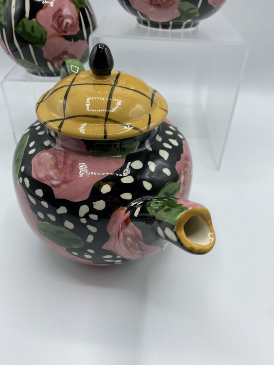 Droll Designs 3 piece Tea Set Black/White Pink Flowers Charming! /rb