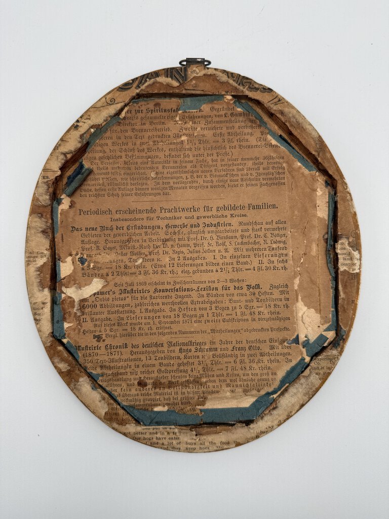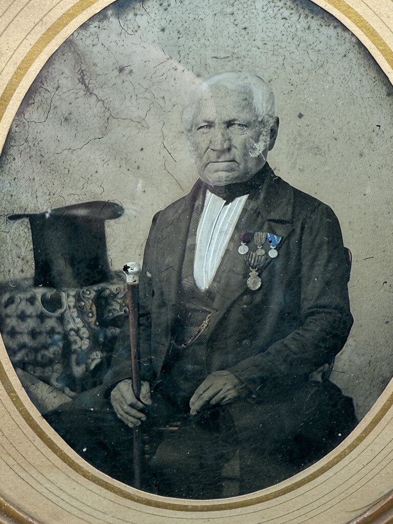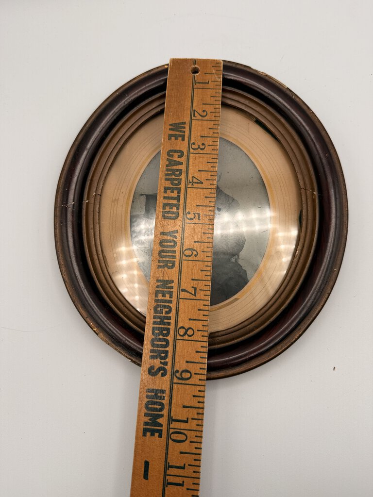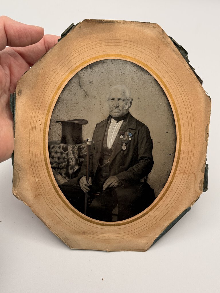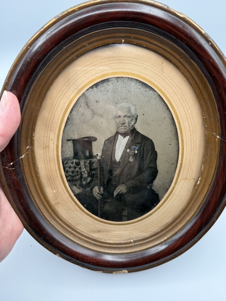 Antique glass plate photography of a Handsome Dignified Gentleman with his Top Hat by his side and cane in his hand wearing his medals on his chest. This photograph is a glass plate that measure approximately 4” x 6” and the man’s medals and shirt are hand colored. The photograph is in a round oval wood frame and held in place by a pages from a book in German. The frame does have some damage. Overall a unique interesting piece of history and art.