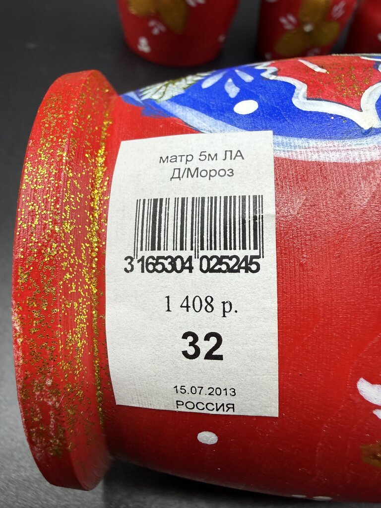 Five piece wood Handpainted made in Russia Santa nesting dolls. Largest doll figure measures 6.5” tall and has the original makers sticker, made in 2013. Brightly colored Smiling Santa accented with gold glitter. No damage found.