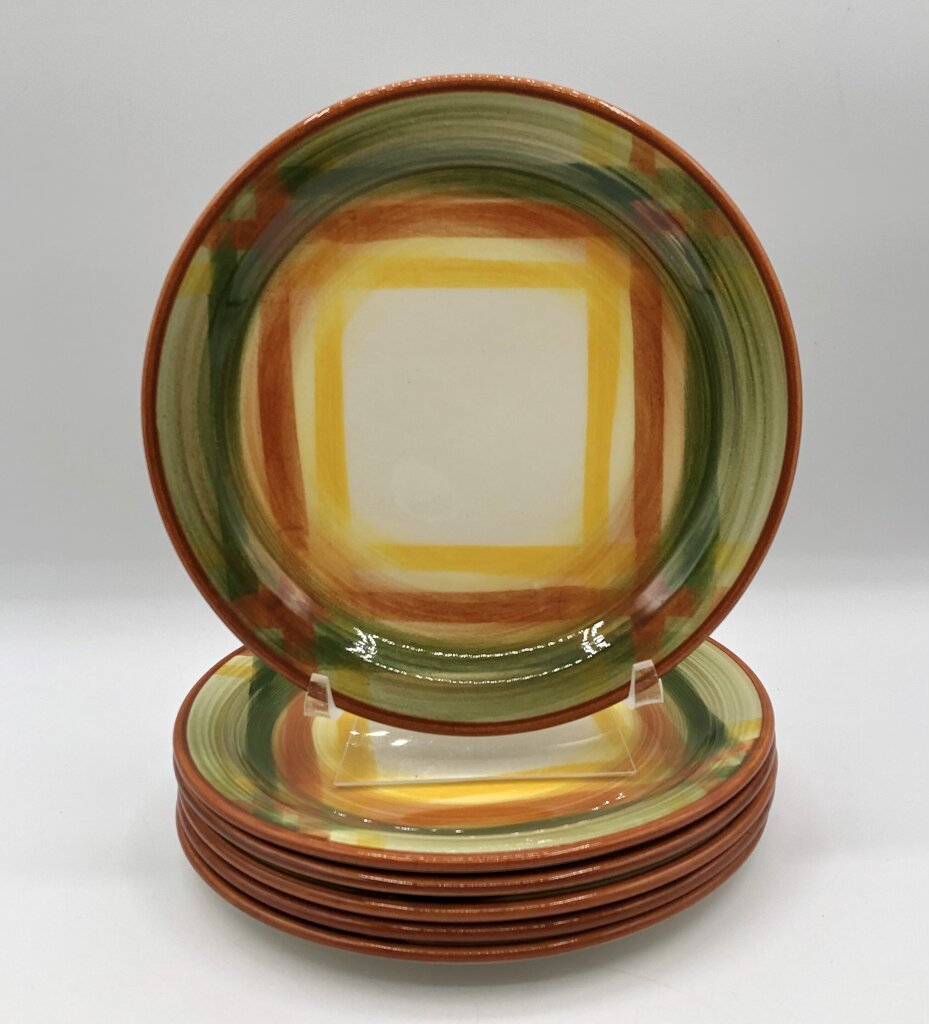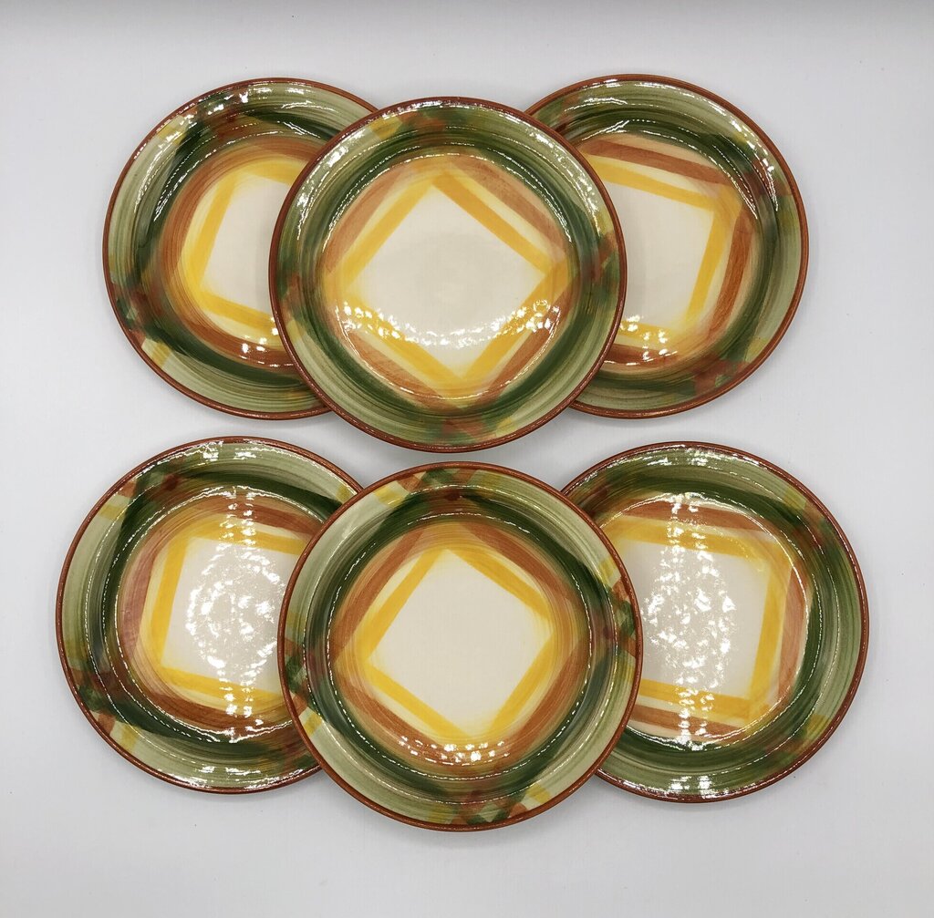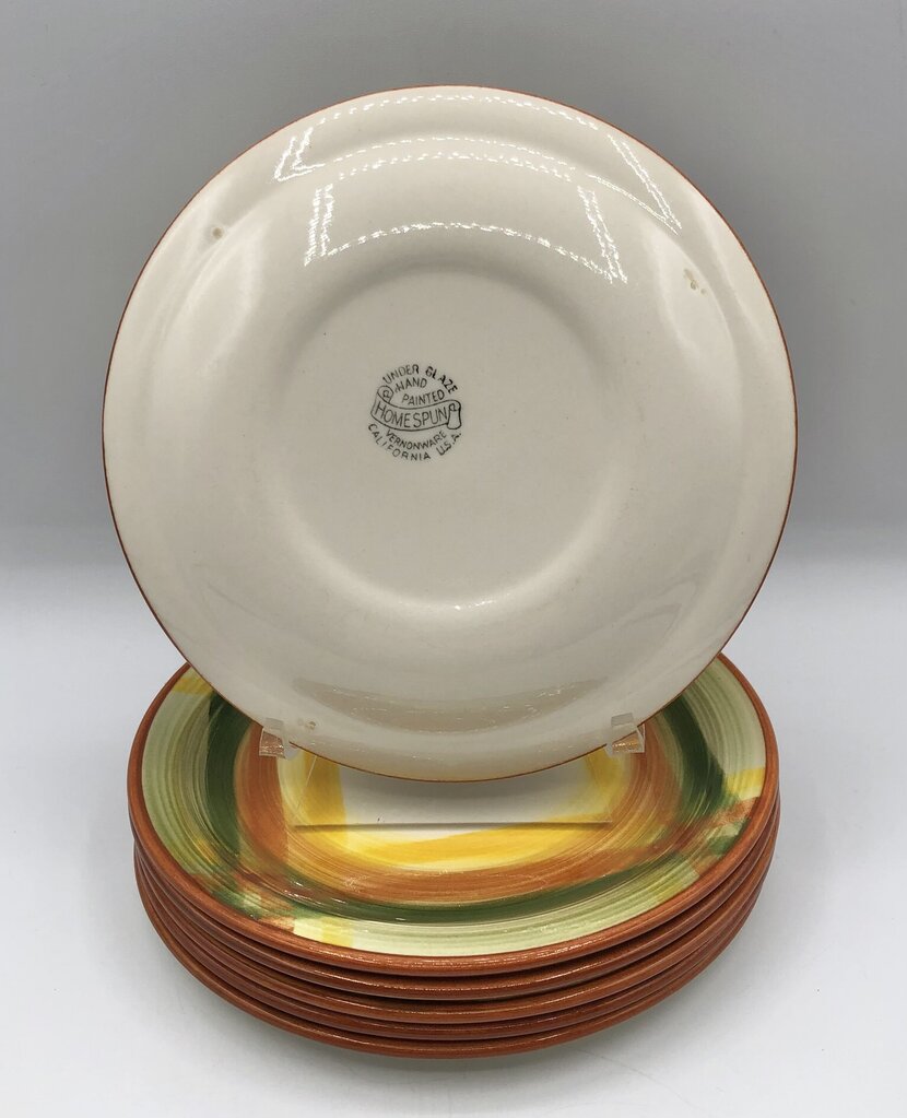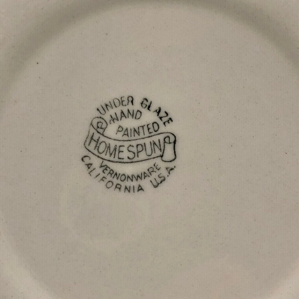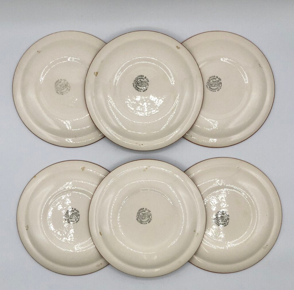 This set of 6 Vernonware Homespun bread plates were made in California by Vernonware Kilns, pre 1958.