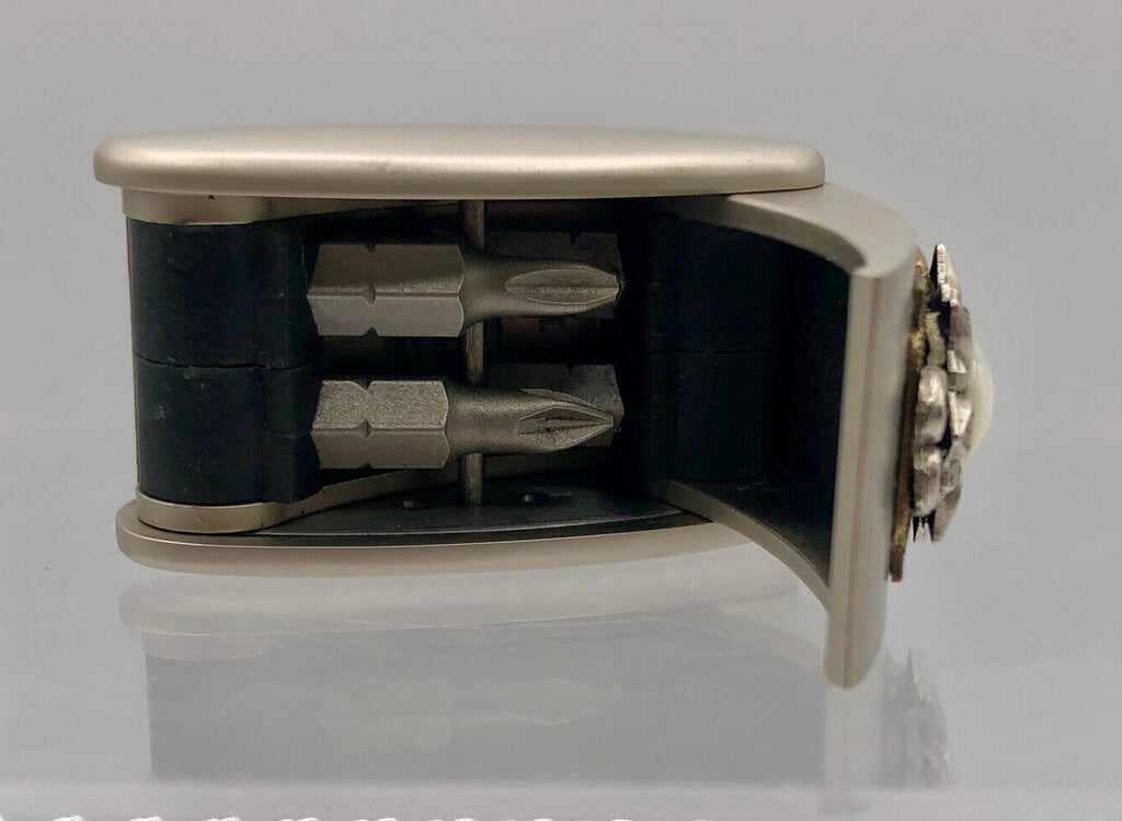 This embellished Ann Cichon Dallas screw bit case holds four different sized flat and phillips head screw bit.