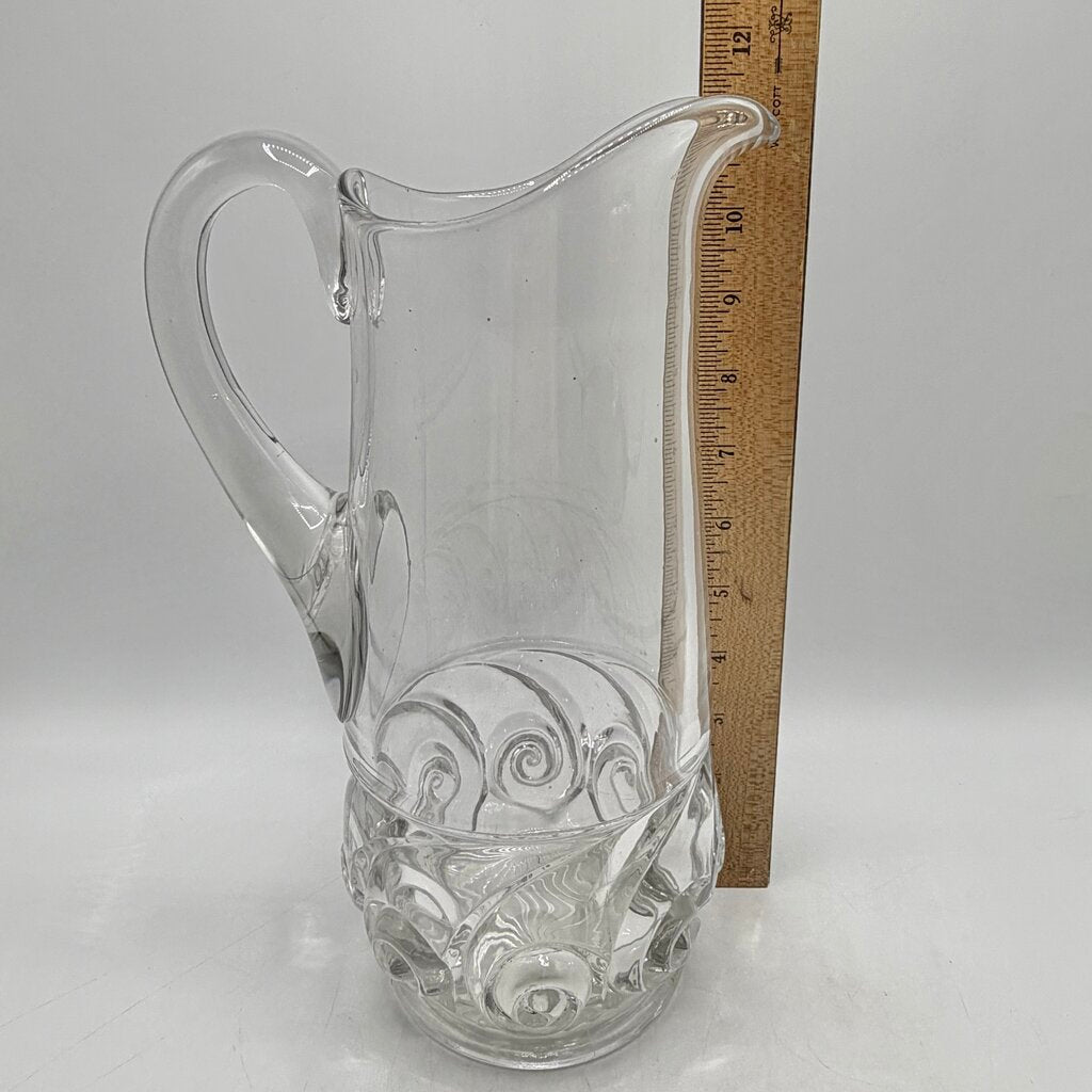 Antique Duncan & Miller Snail water tankard, a prized example of Early American Pattern Glass from the late 19th century. Standing an impressive 11 1/4” tall, this is a substantial piece, larger than the mod commonly seen milk pitchers in this pattern. The snail pattern is distinguished by its distinctive spiral motifs tan evoke the pattern’s namesake. This pitcher is in good antique condition with light age and use appropriate wear. Two of the spirals show light chipping, but that is really only obvious when touching them. Measures 11 1/4” tall, 7” wide from handle to spout, with a 4” bottom diameter.