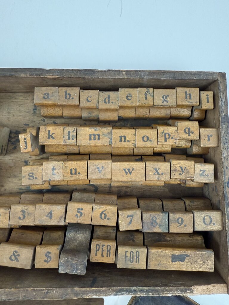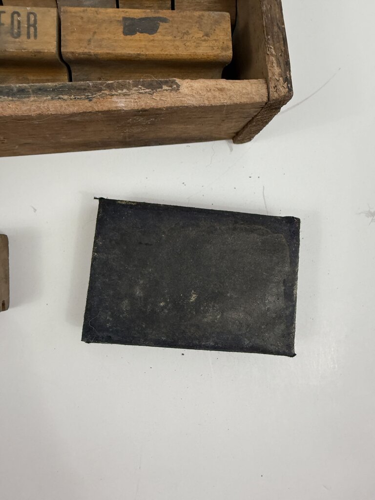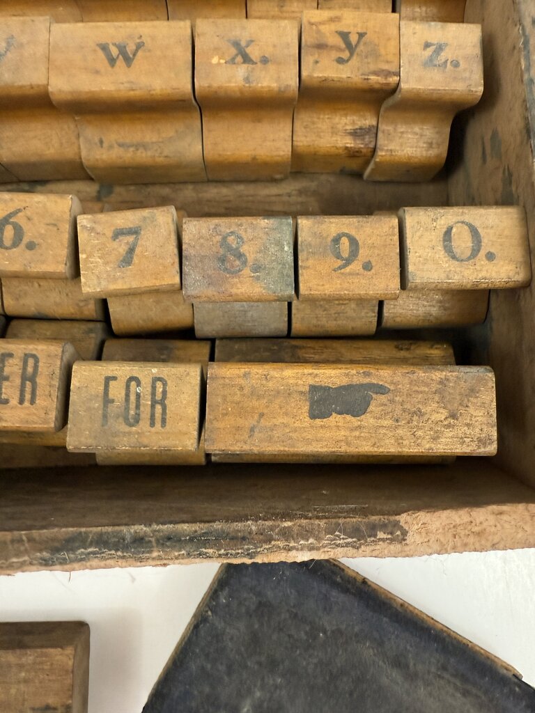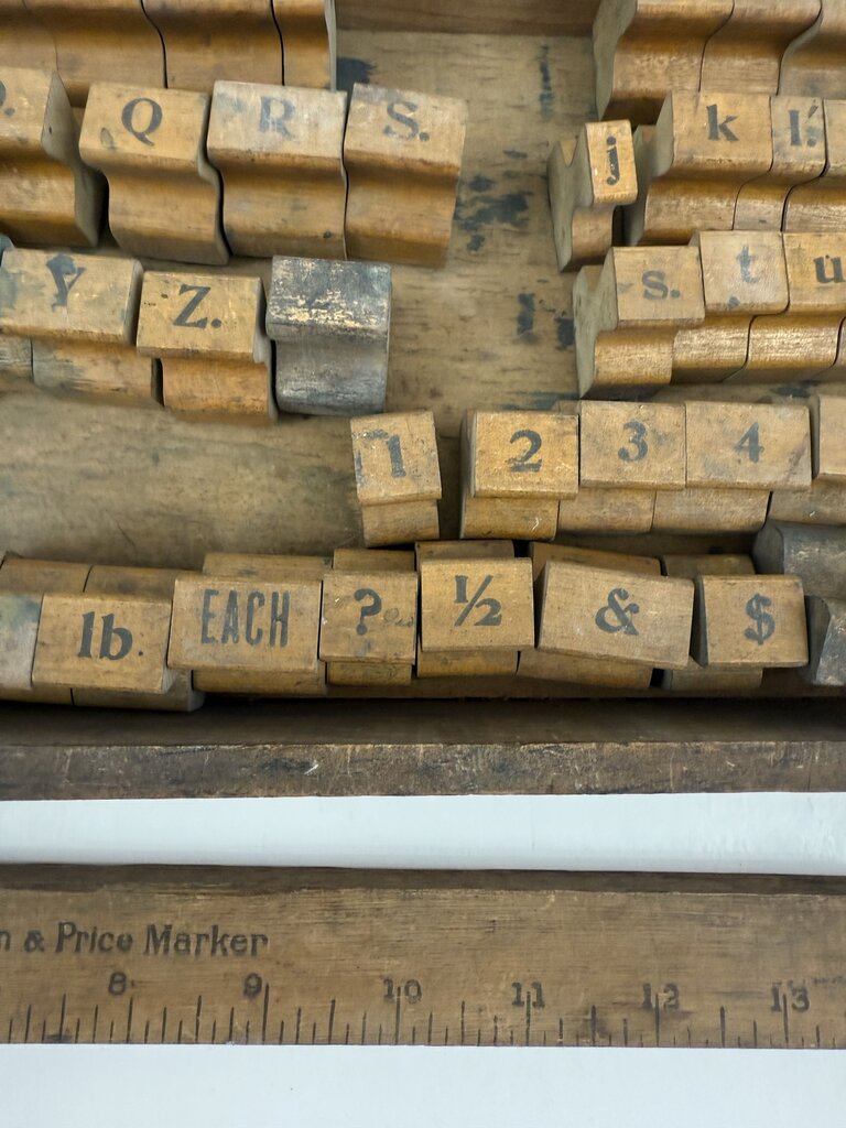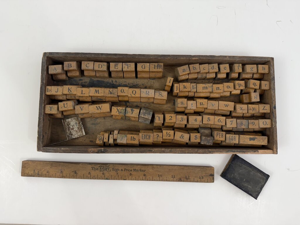Antique “The Art Sign & Price Marker” sign making set used for sign making at stores. In original wood storage box, no lid. The capital Letters are missing the P, there are two capital Z’s. The lower case letters are complete and the numerals are complete. Seventy seven total stamps with ruler and ink block blotter. No Ink. Not tested with ink. Unique set.