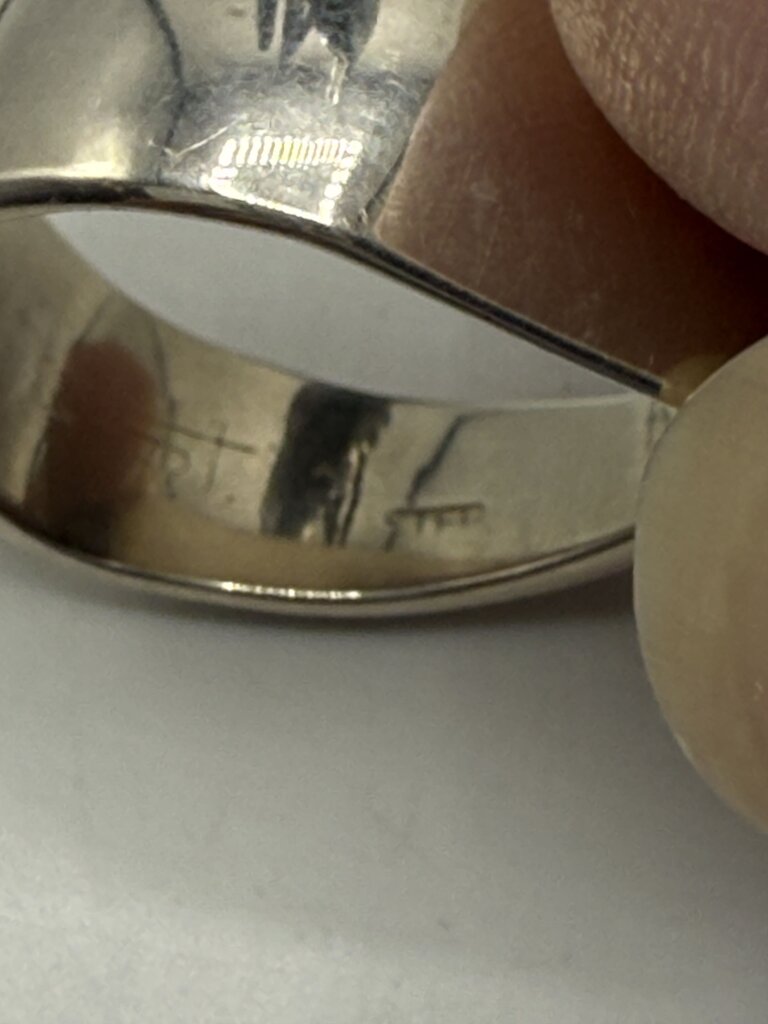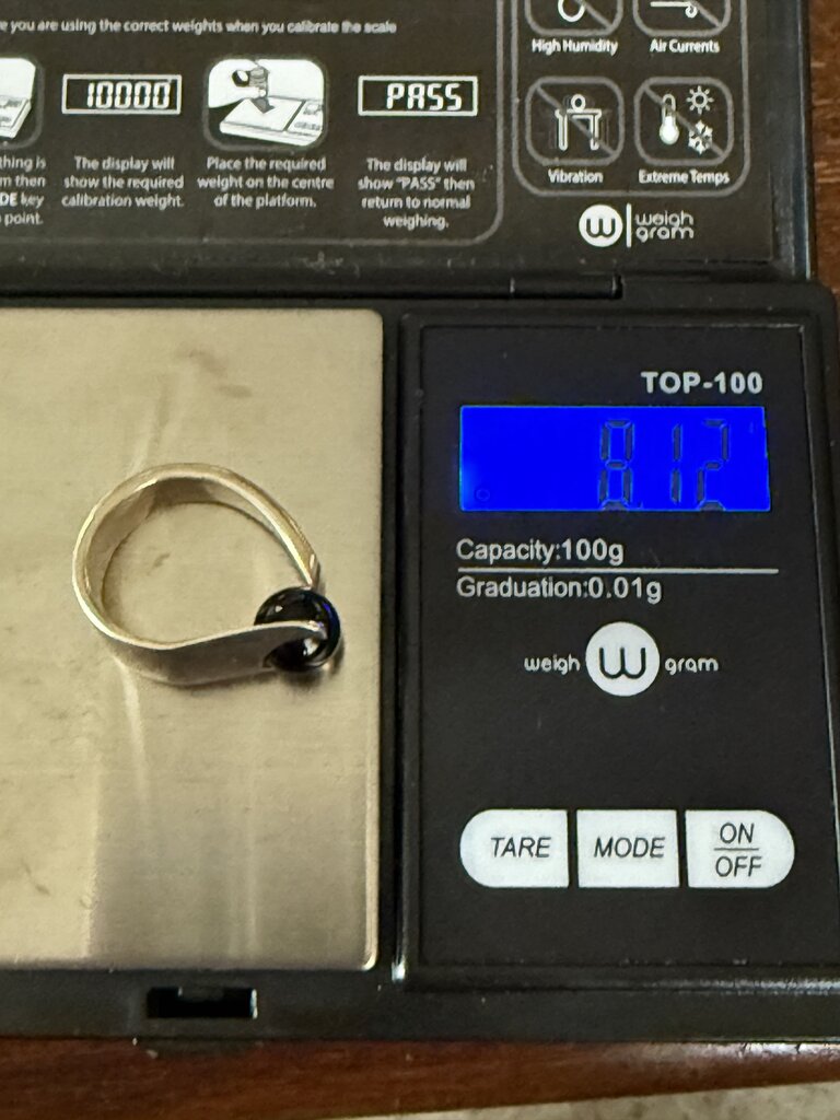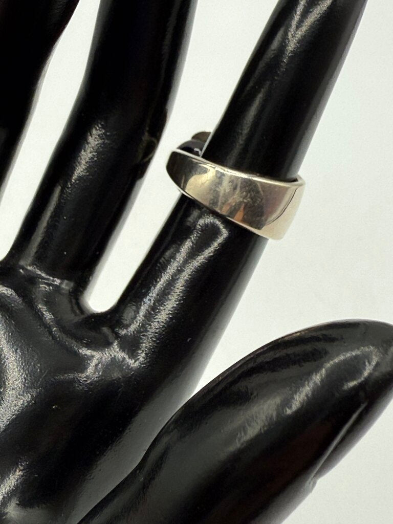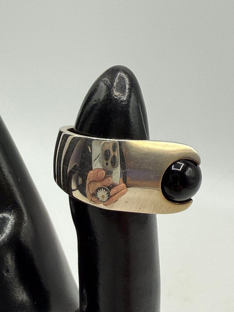 Eye Catching Black Onyx Ball Gemstone off-set in an asymmetrical sterling silver band. This Attractive ring weighs in at 8.12 grams and is a size 6 band. Light scratches on back of band from use.