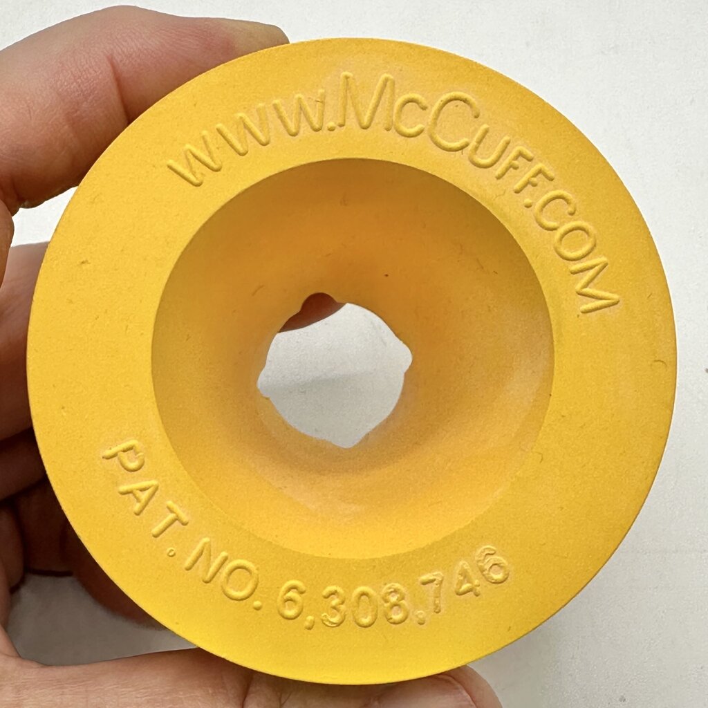 Big Al's McCuff is a gas fill device manufactured by McCuff Industries that is designed to prevent spills and splashing when refueling motorcycles, cars, boats, and other watercraft. It creates a vented interface between the fuel pump nozzle and the tank, reducing nozzle intrusion and allowing the tank to fill completely without the nozzle clicking off prematurely or spilling fuel. Our example is unused has an 2 3/4” diameter and includes a carrying bag with a strong Velcro strap for easy attachment to a vehicle's frame or luggage rack. Both are in excellent condition.