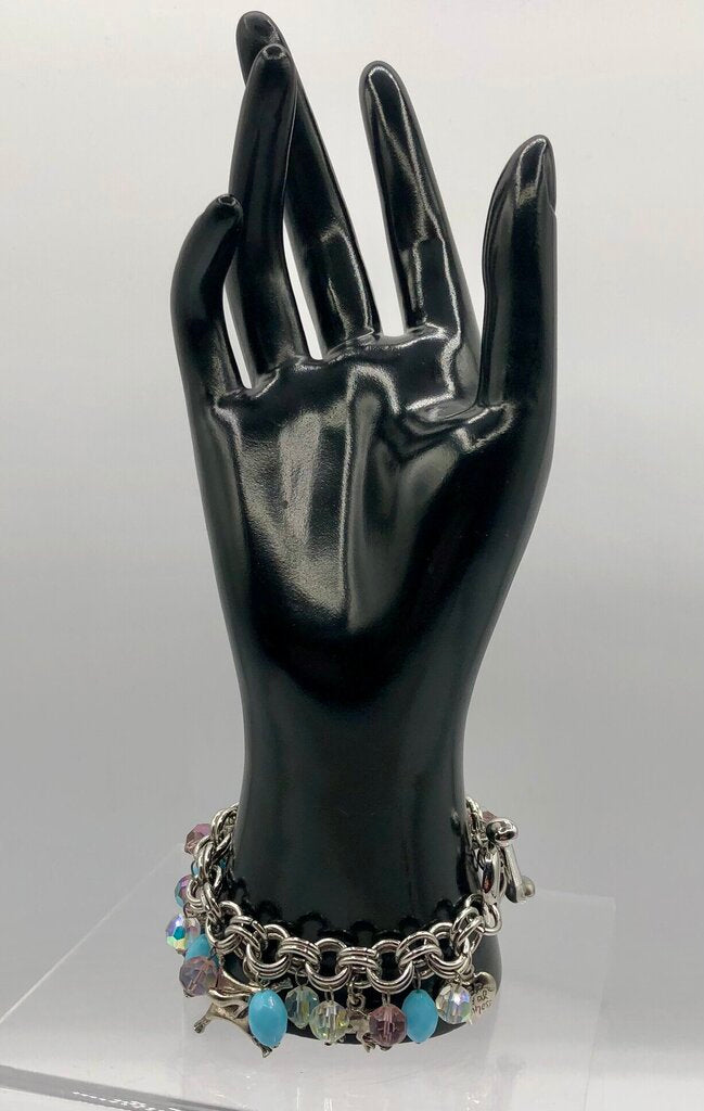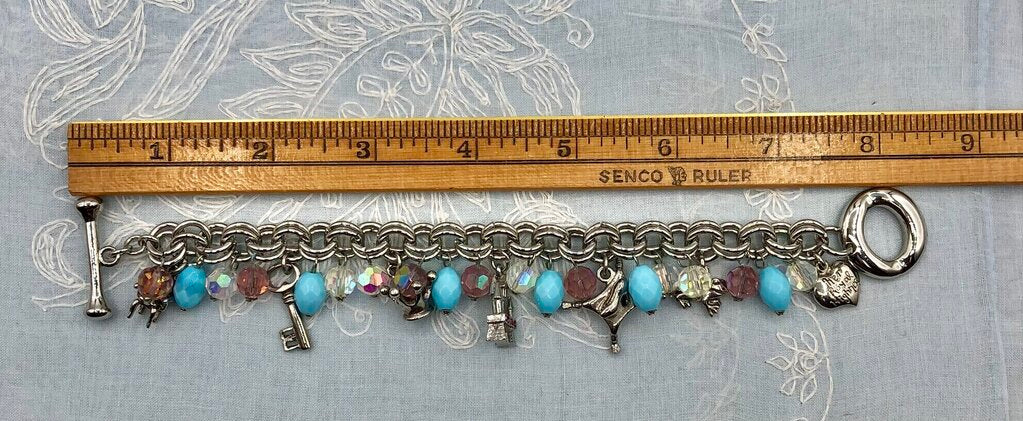 Fun and fanciful silver toned charm bracelet with double chain and toggle closer.