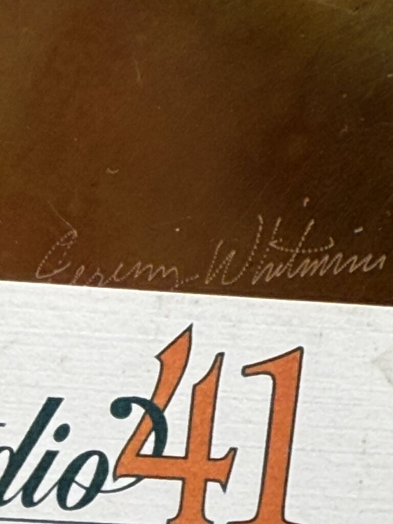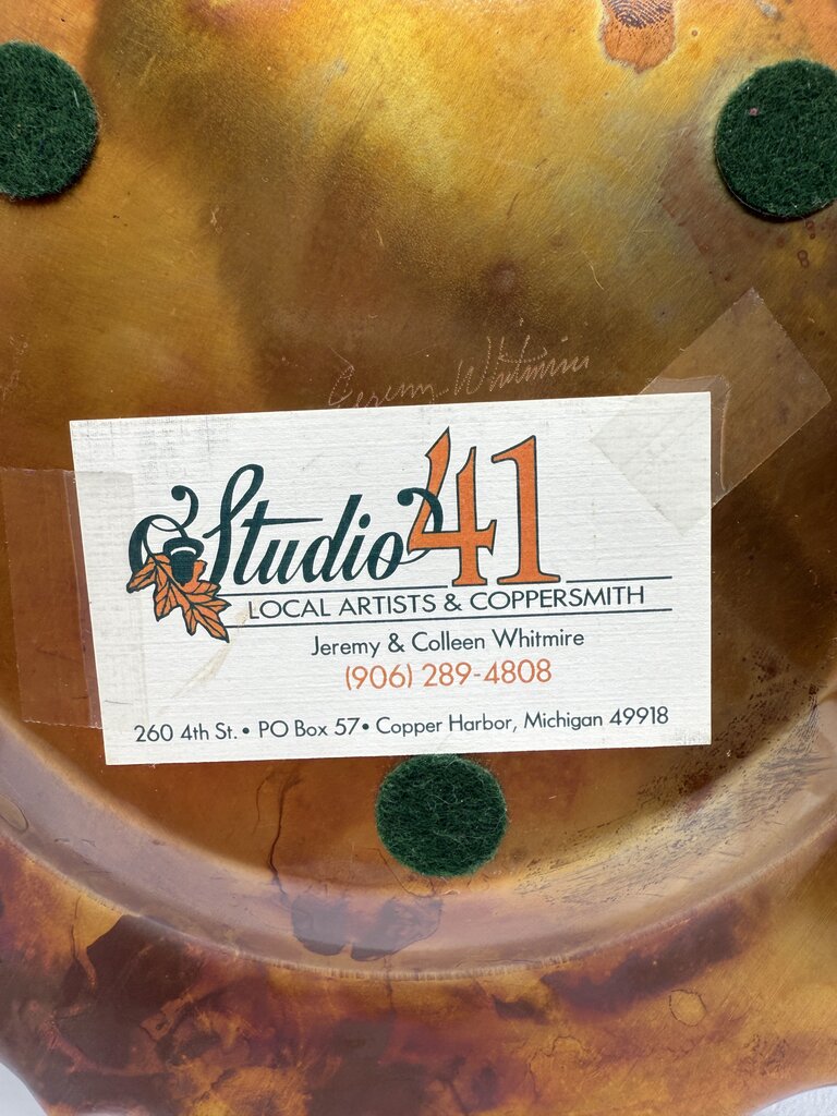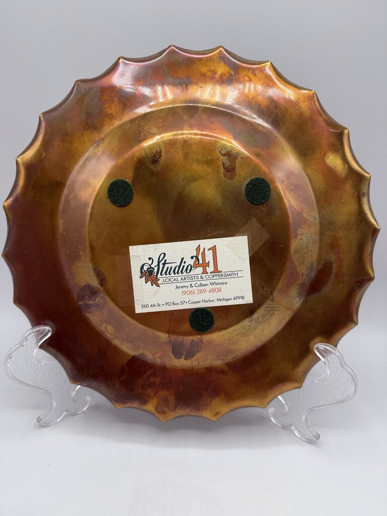 Artist signed handmade Copper platter with scalloped edge measures 12” in diameter and 1” deep. Signed by artist Jeremy Whitmire from Studio 41, Local Artists & Coppersmiths, Copper Harbor, Michigan. Vintage copper platter with a nice patina from age. A few marks are found in the center of plate. Would make a nice display piece, has felt feet on bottom to protect your fine wood surfaces.