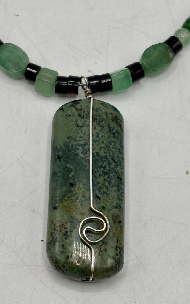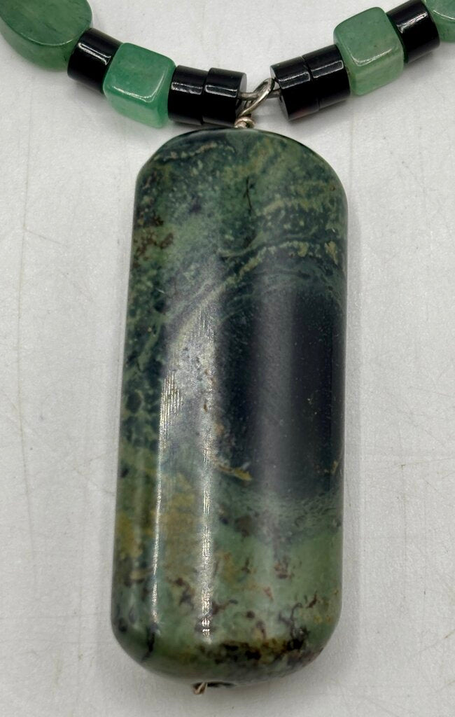Beautiful Jade Bead Necklace, 21 inches long, with pendant. This evil ace has beads that are of varying shapes and sizes with a 1.5 inch embellished pendant. The chain is sterling silver. This is a lovely statement piece and also one that can be layered with other necklaces.