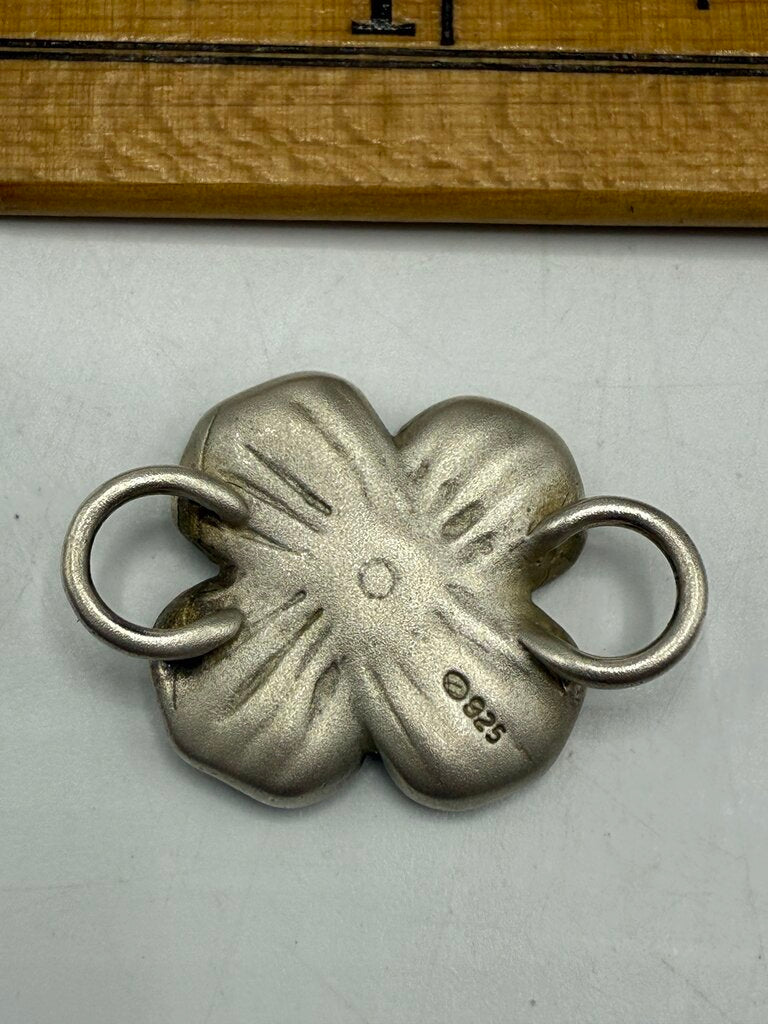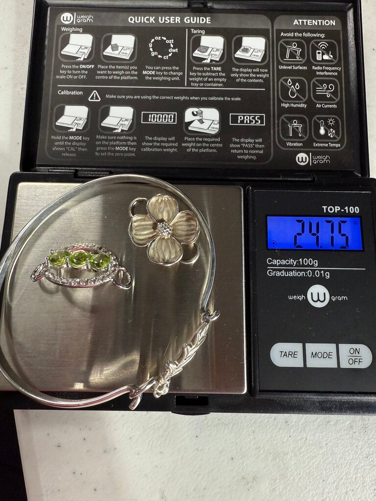 Lestage brand Convertible Bracelet with 3 different claps. Sterling Silver cuff style bracelet with 3 different clasp all sterling silver, Oak Leaf, Dogwood Flower and the Regal 3 Peridot Clasp. Gram weight is over 24 grams of sterling. No damage found.