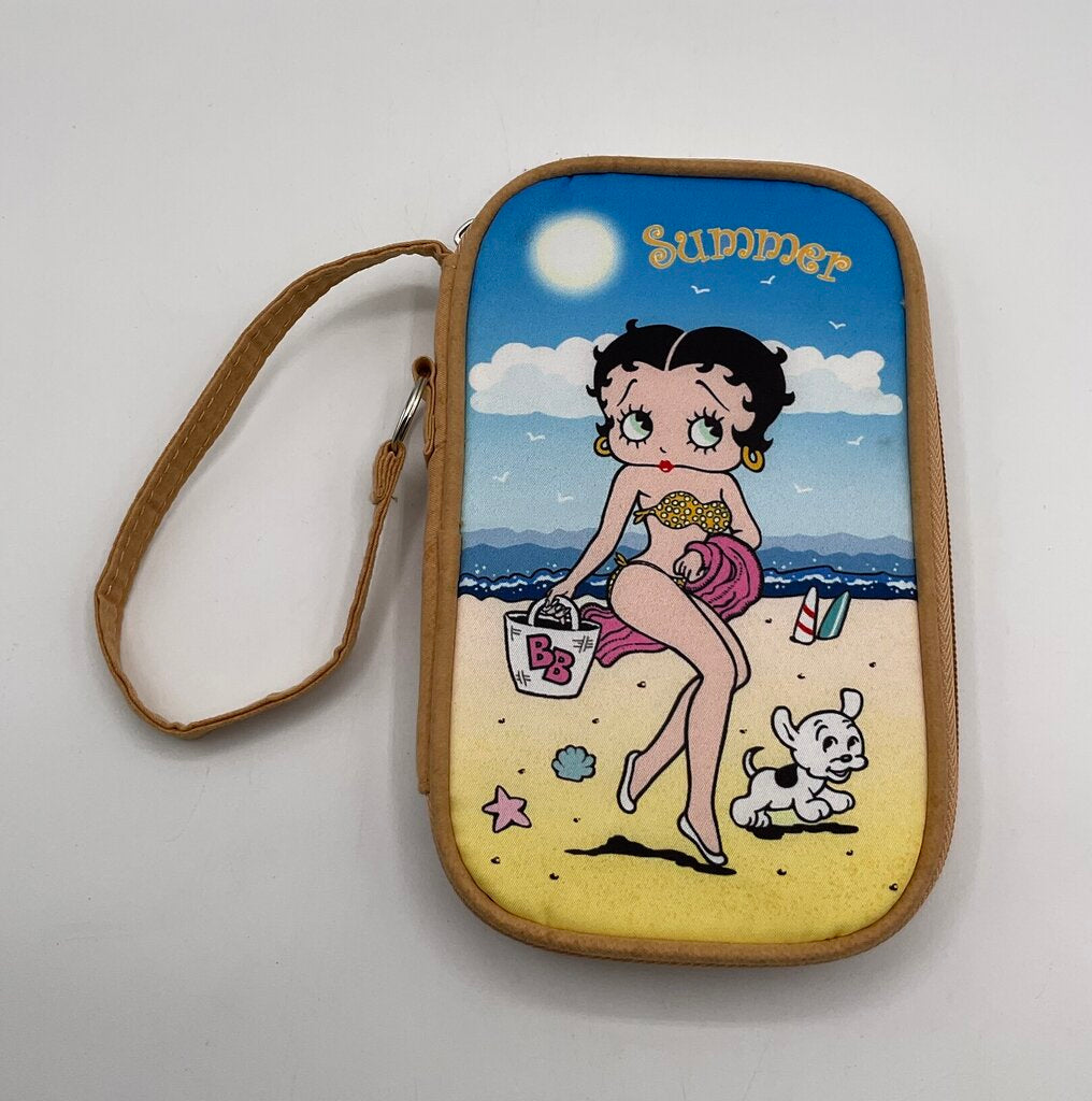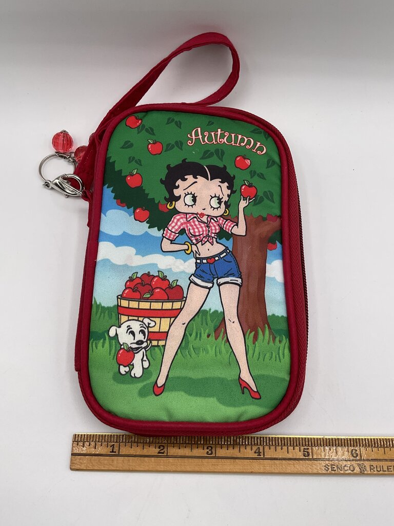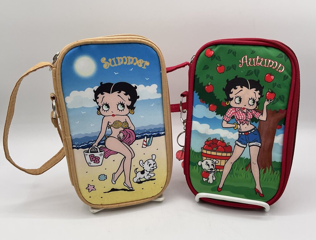 This lot of two (2) soft clutch purses feature the iconic cartoon character Betty Boop and her furry companion Pudgy. One of the purses is Summer themed, with Betty on the beach in a bikini. The other is Autumn themed, displaying Betty and Pudgy picking apples. The Autumn clutch still has its original keychain with it, the summer does not have one. Both purses are in fantastic condition, no rips, tears, or any other damages. Please review all photos for overall conditions. Botch clutches measure 7 3/4” by 5” and both together weigh 8.5 ounces. Estate item. Condition is pre owned. Ships USPS Ground Advantage Mail.