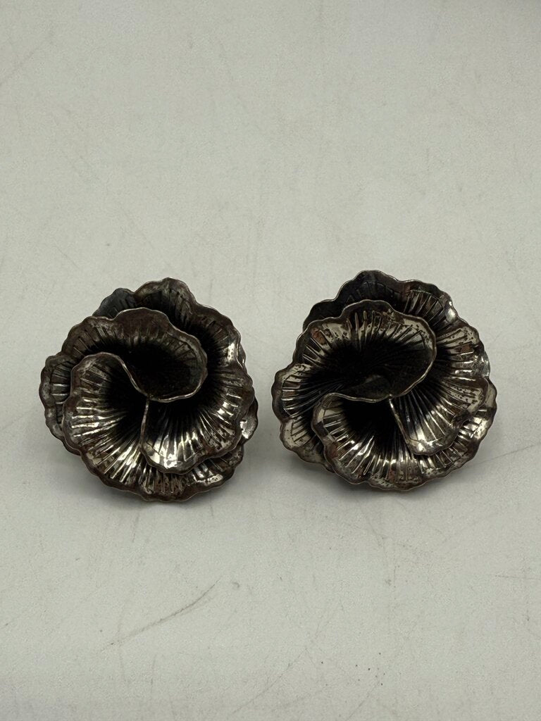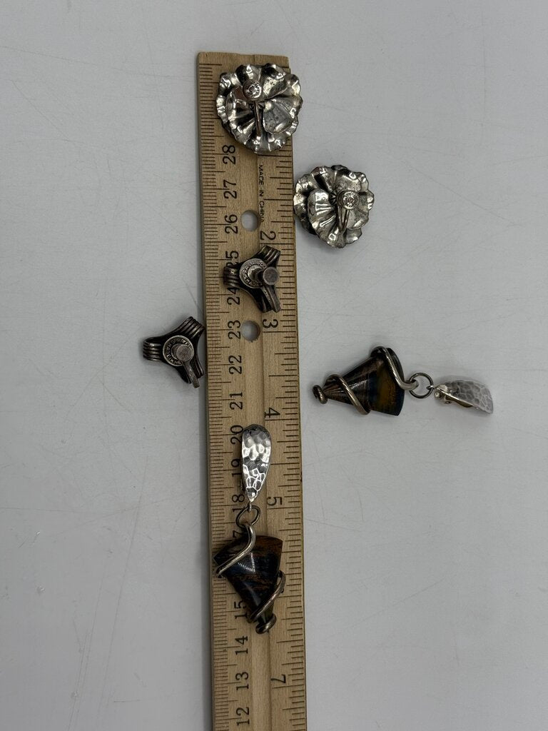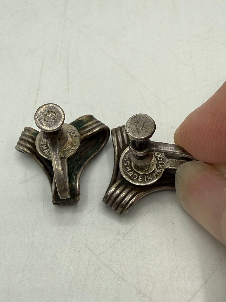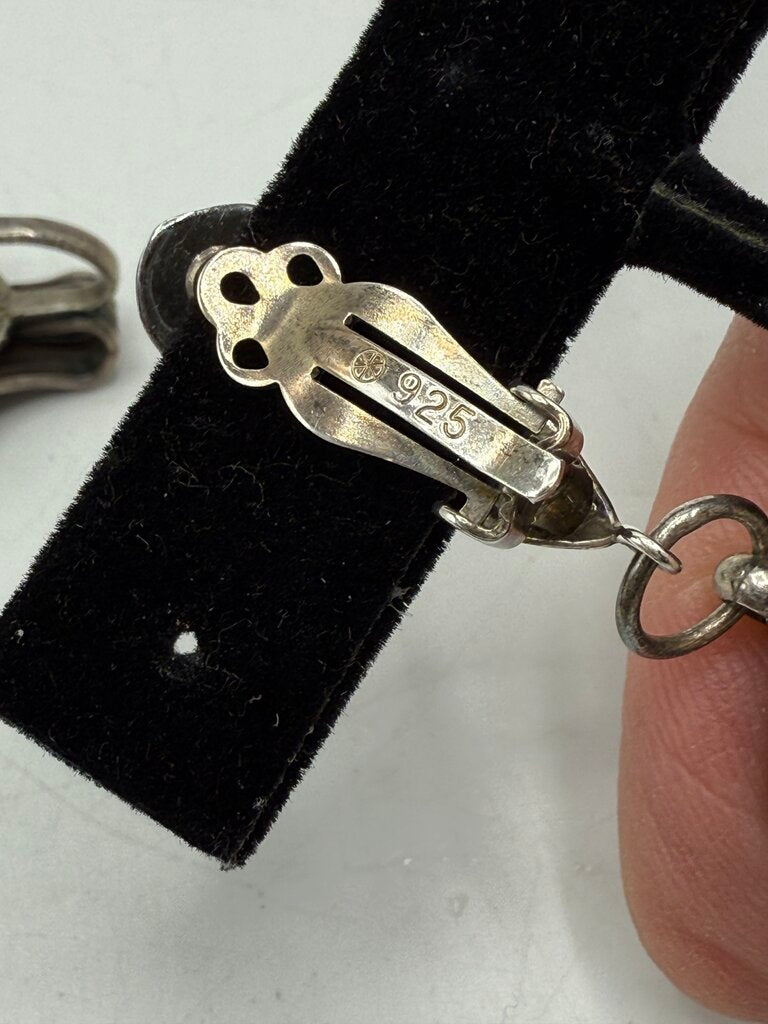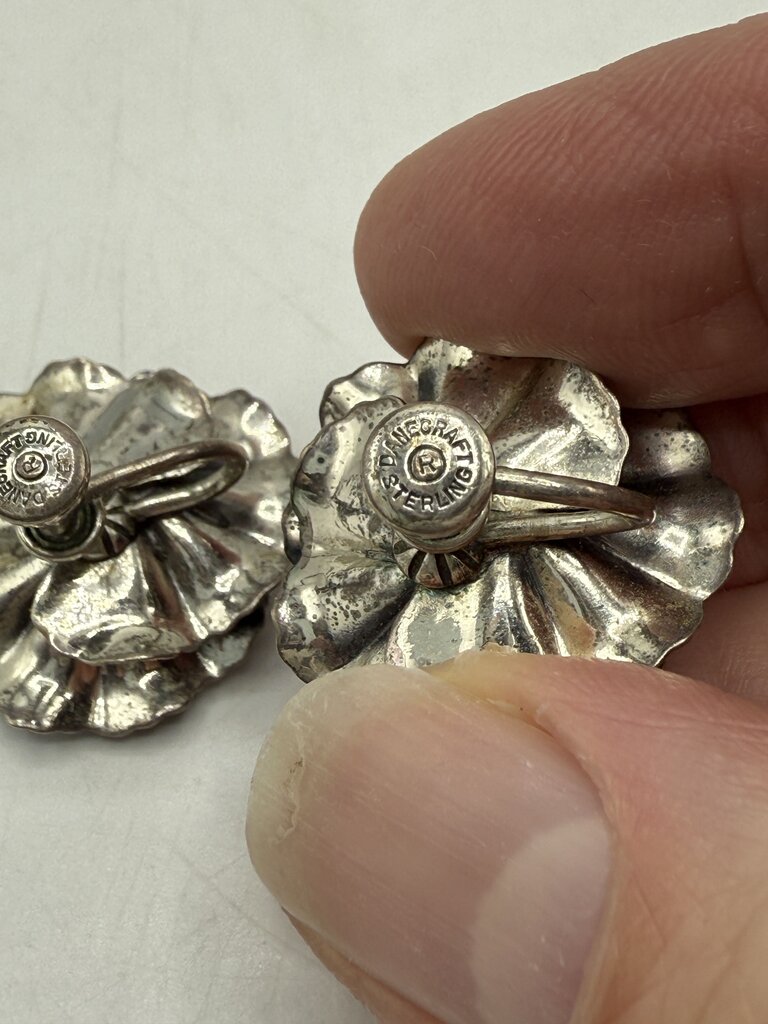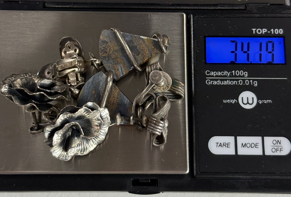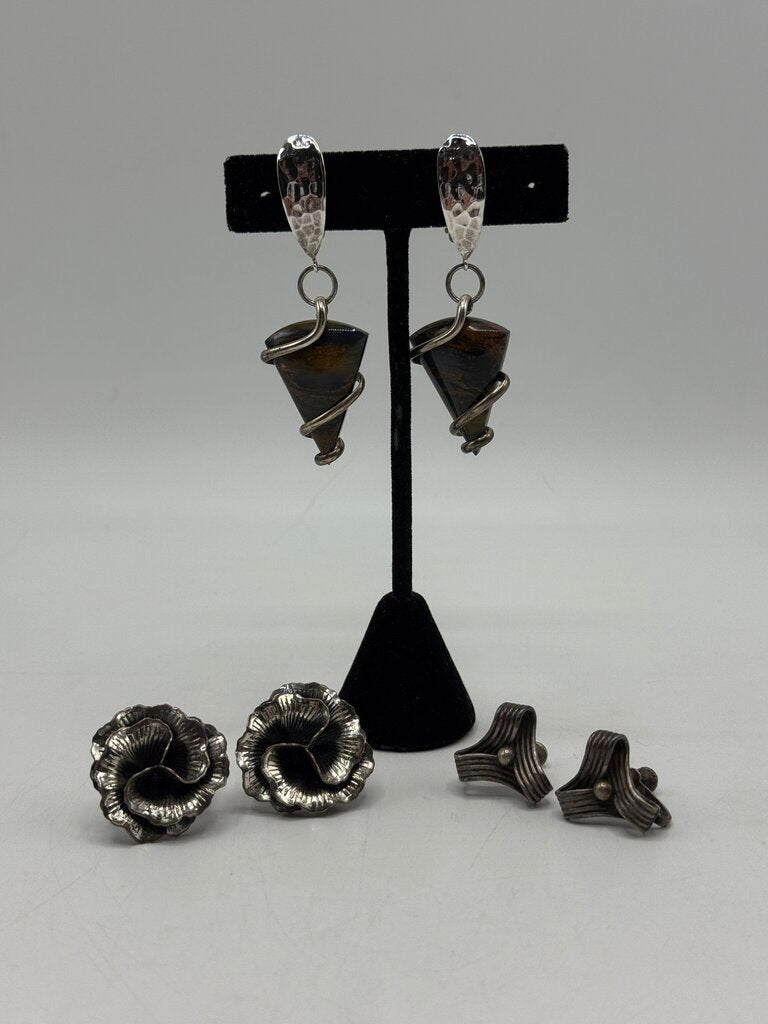 Vintage lot of 3 pairs of Sterling Silver Earrings. Two pairs are screwback style and one is clip style. DaneCraft Flowers, Mexico art deco style and the clip-ons have a semi precious polished stone. Combined weight, including stones is 34 grams.