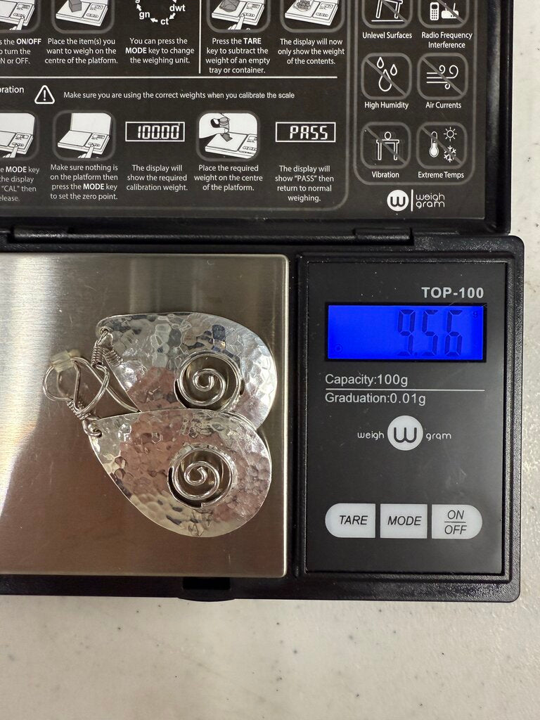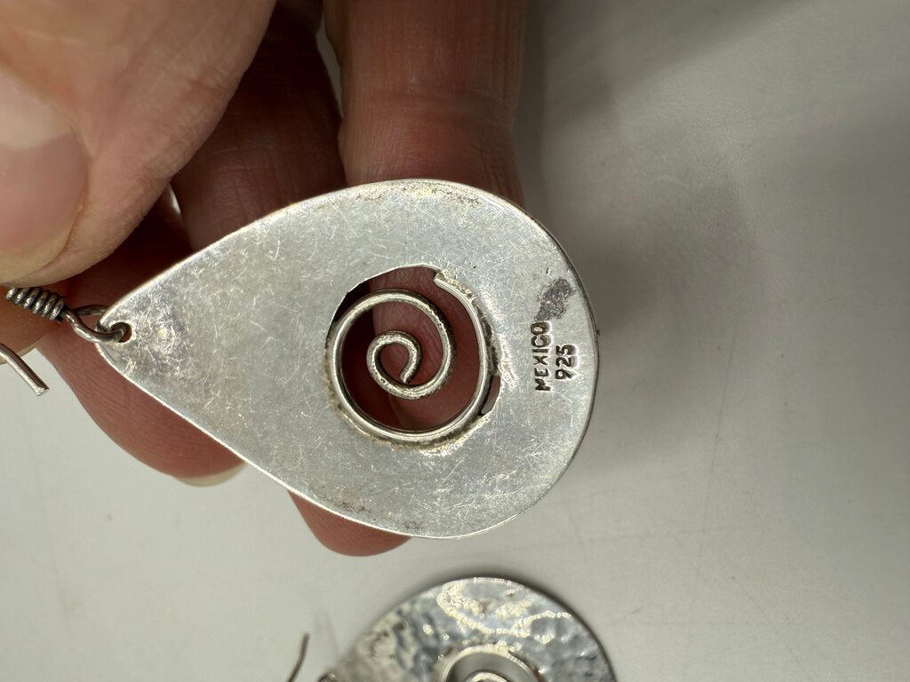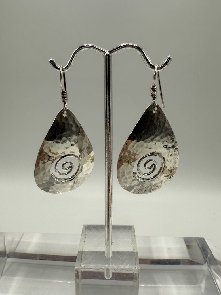 Estate item. Tear drop shaped Hammered Sterling Silver pierced earrings with a silver swirl center. Earrings are hallmarked on the back Mexico .925. The teardrop measures 1.5” long by 1” wide. Gram weight is 9.56.