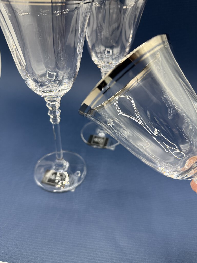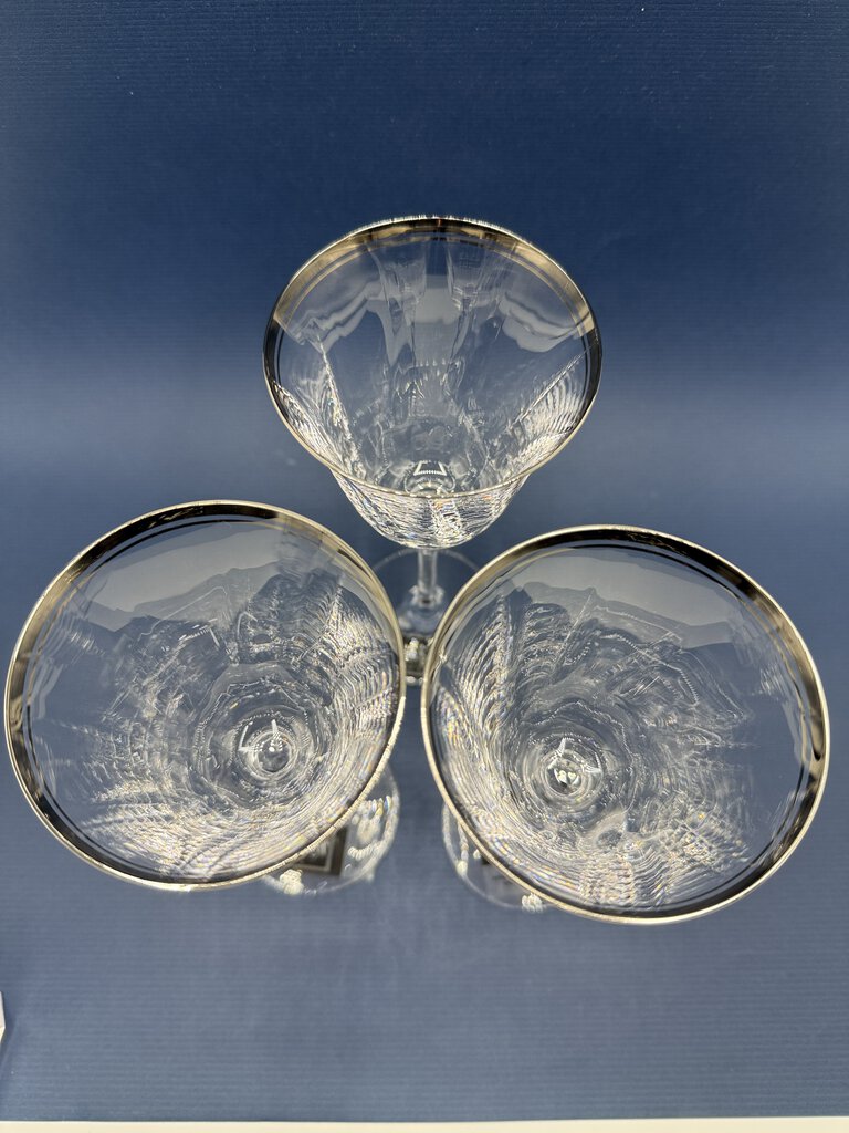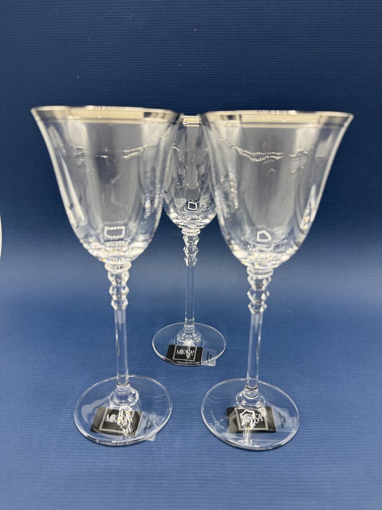 Set of 3 crystal Mikasa Sonata Platinum wine glasses, never used, with their tags on bottom. The glasses measure 8” tall and have 3” in diameter opening. Discontinued pattern.