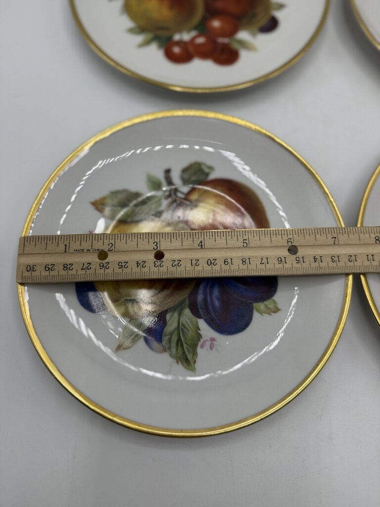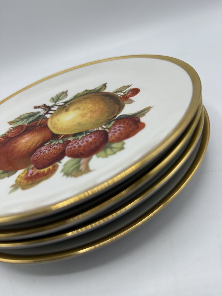 Mitterteich Bavaria Fruit pattern set of 4 dessert plates, measuring 7.5” in diameter and one serving plate, 12” in diameter. Colorful set with a variety of fruits displayed on each plate. No chips, cracks or stains, gold trim still strong.