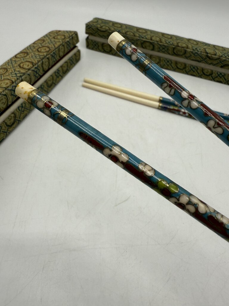 Two vintage sets of Cloisenne chopsticks by Moon Gate from Singapore in silk storage boxes. The Chopsticks are white bovine bone with multicolor floral Cloisenne patterns on both sets. Chopsticks measure 8.5” long.