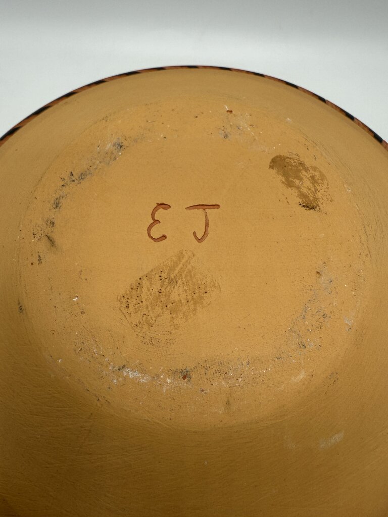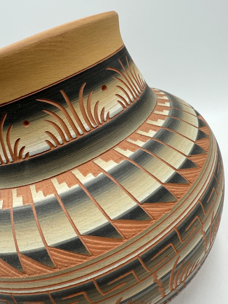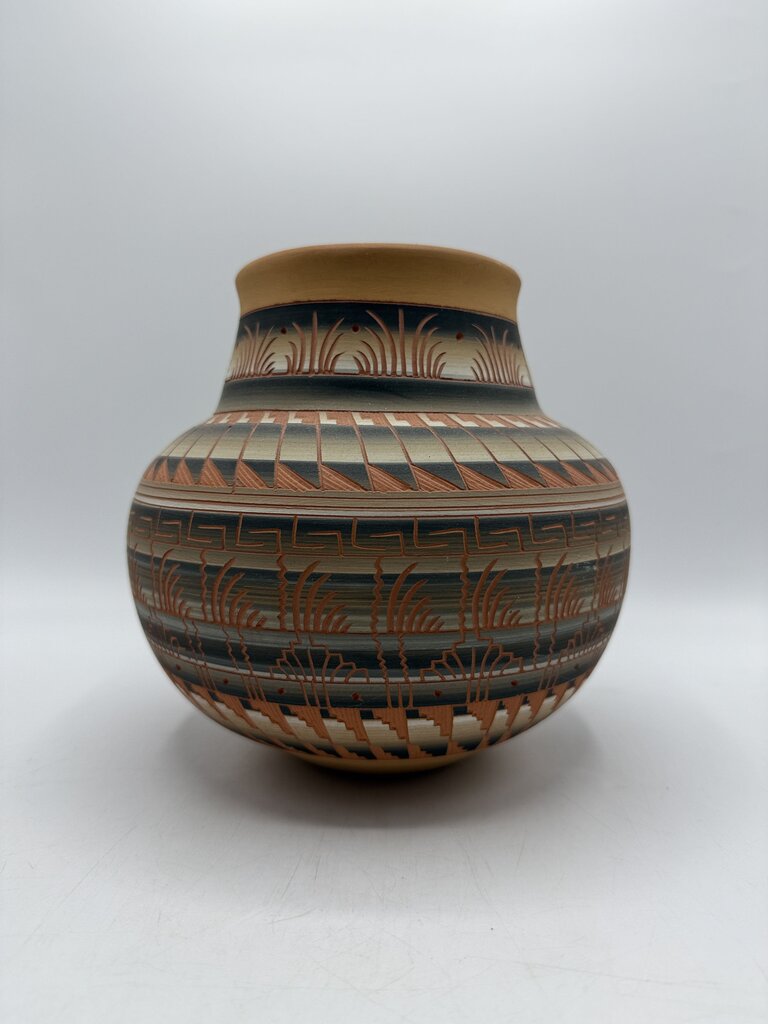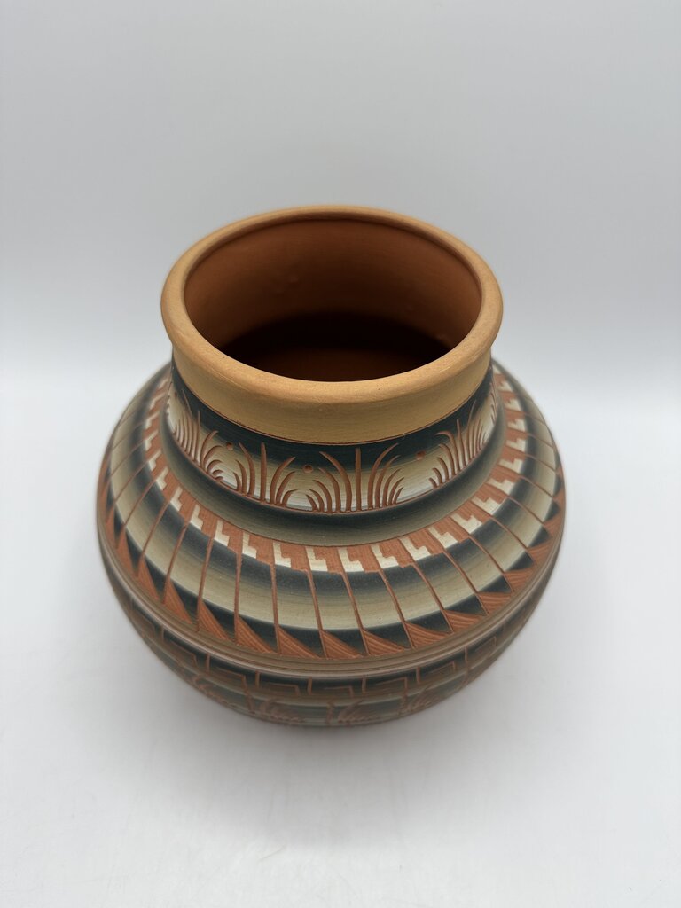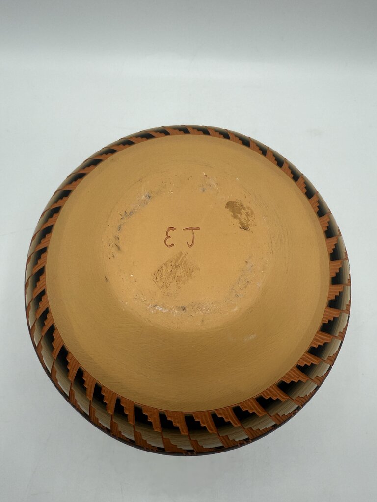 Fine detain is found with this handmade etched clay pottery from the southwest Native American Navajo tribe. Terracotta colored clay with white, black and beige tones. Pot measures 7” tall and approximately 8” inches diameter. Signed on the bottom E J. No chips, cracks or scratches in finish. Sits flat.