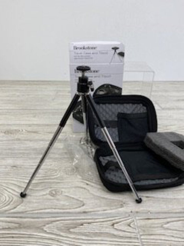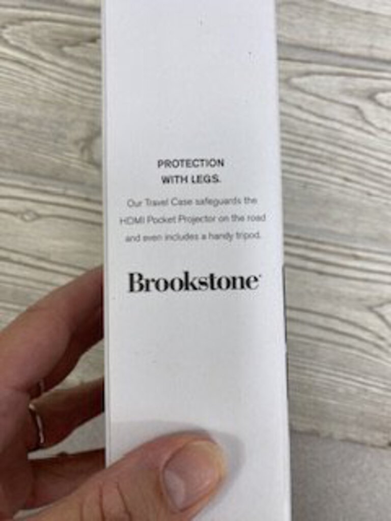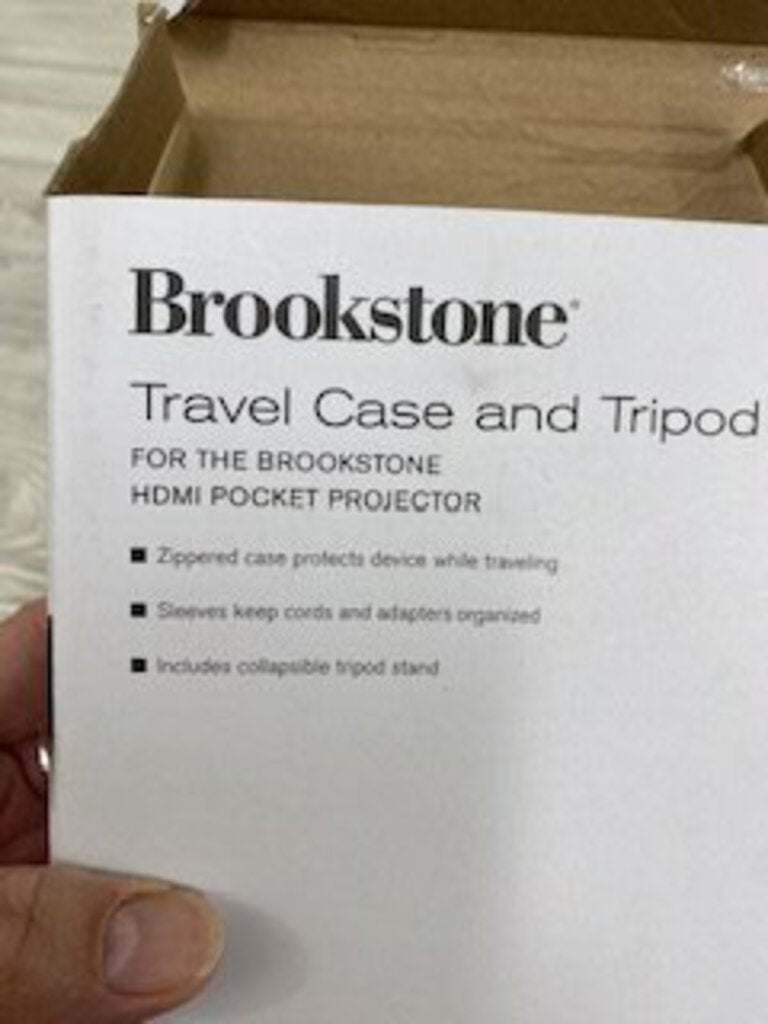 New in original box, this Brookstone Travel Case and Tripod are made to use with the Brookstone HDMI Pocket Projector. This post is for the case and tripod only. Never used.