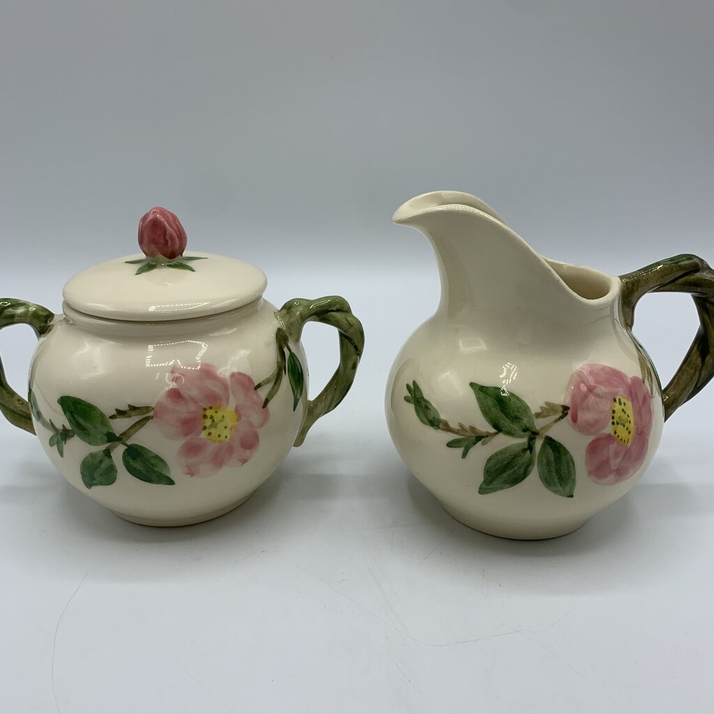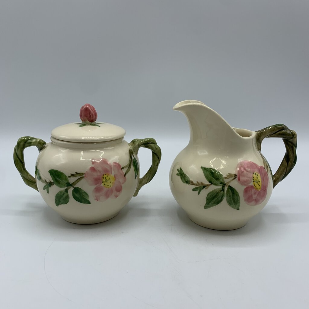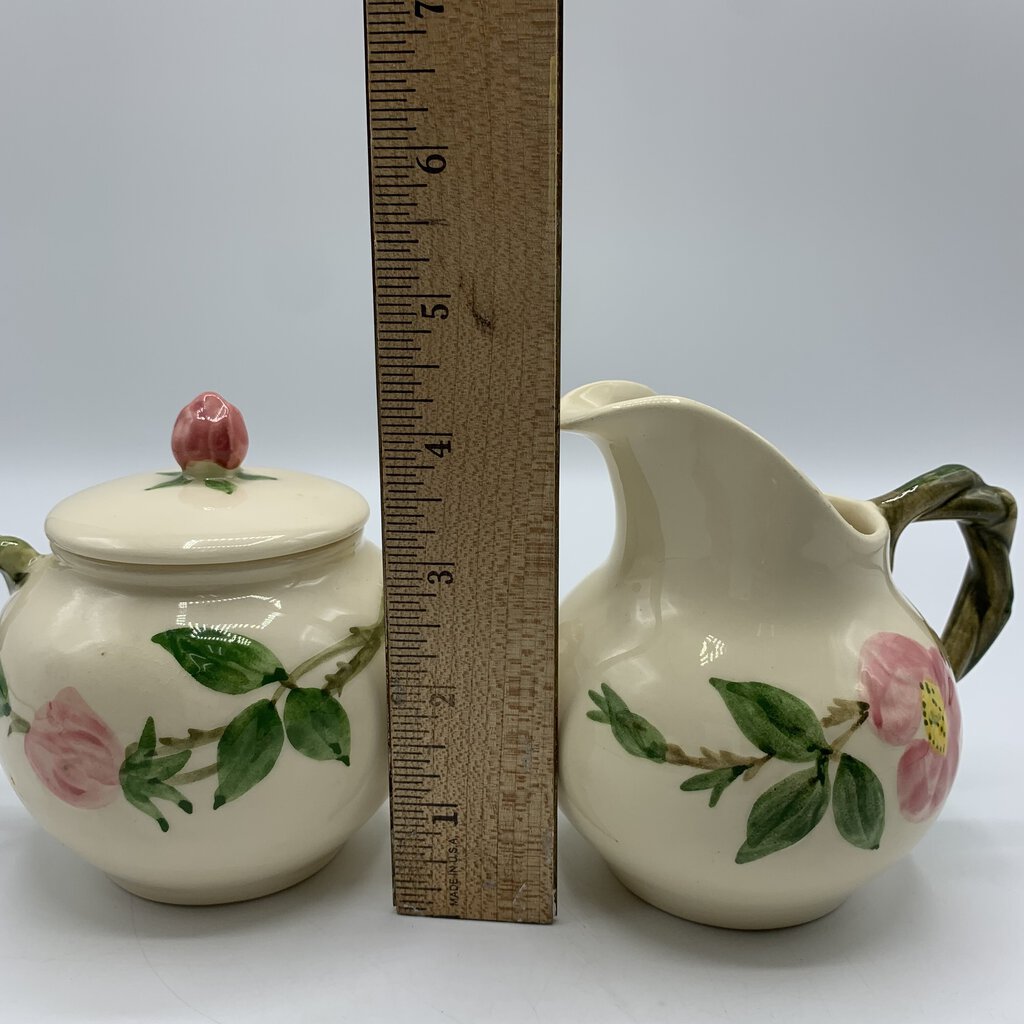 Vintage beauty abounds with this sugar & creamer set, perfect for their intended use or on display in your home. This charming pattern features a lovely combination of pink flowers and green leaves on a creamy white backdrop. Made of durable earthenware, this pattern has really stood the test of time. It was first introduced in 1941 and has grown to be one of the most beloved and collected casual dinnerware lines in American history. A timeless classic that is cheery, charming, and inviting!