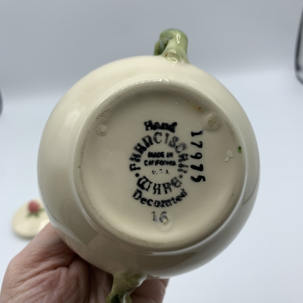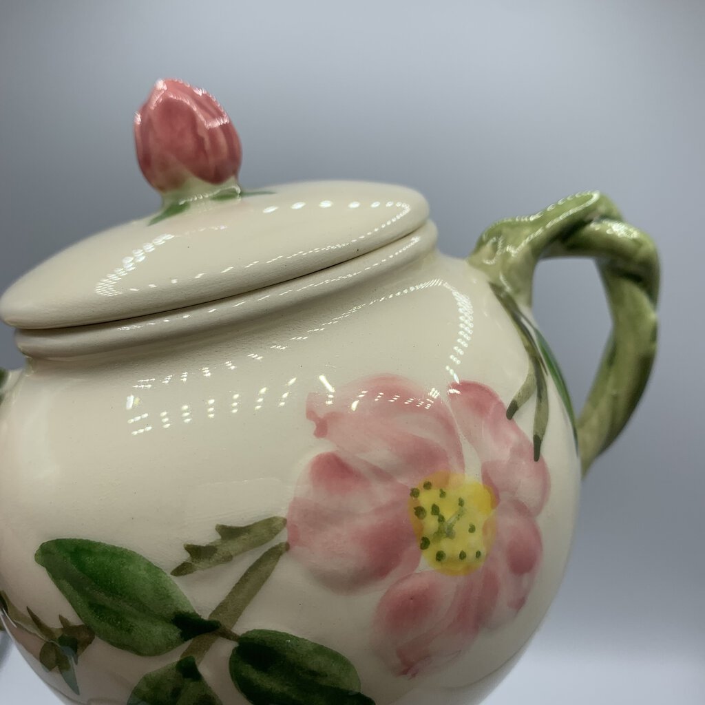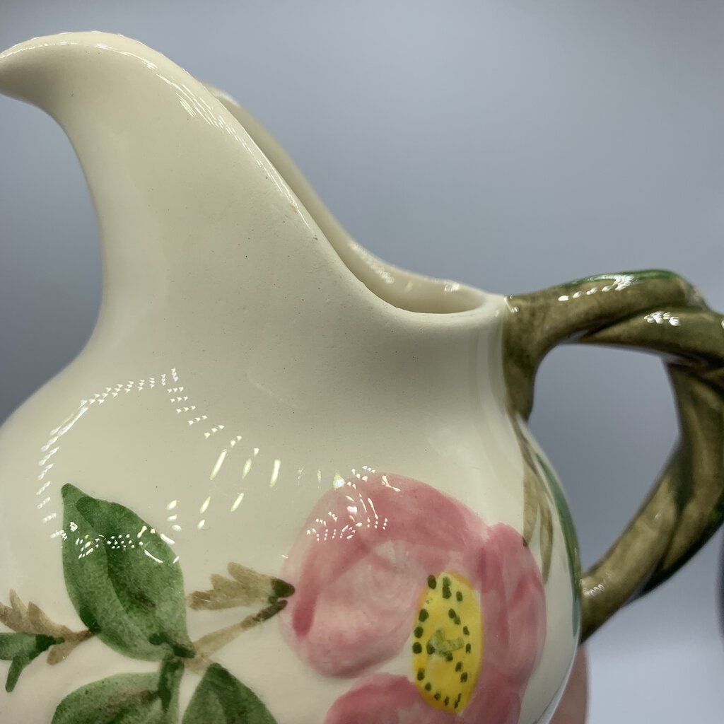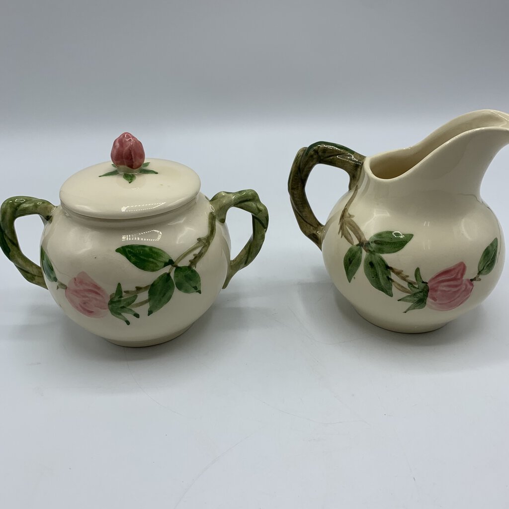 Vintage beauty abounds with this sugar & creamer set, perfect for their intended use or on display in your home. This charming pattern features a lovely combination of pink flowers and green leaves on a creamy white backdrop. Made of durable earthenware, this pattern has really stood the test of time. It was first introduced in 1941 and has grown to be one of the most beloved and collected casual dinnerware lines in American history. A timeless classic that is cheery, charming, and inviting!