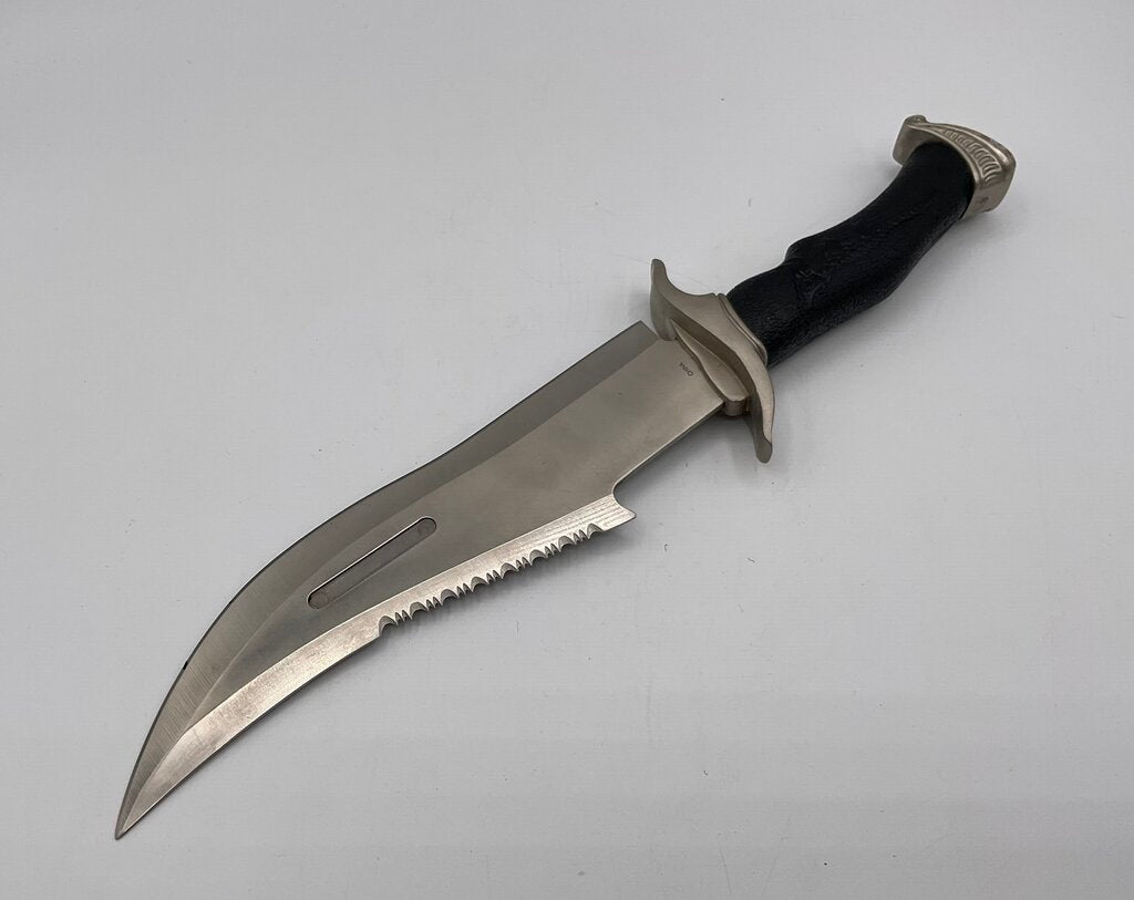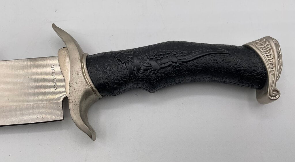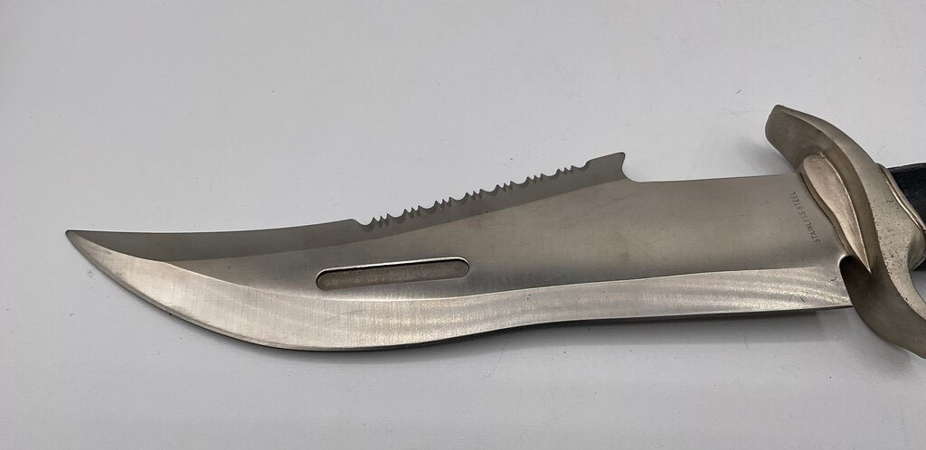 Oregon Trail Bowie Knife with stainless steel blades. 15” overall length with black rubber handle. Comes with a black nylon sheath and original box. This knife is in excellent condition. Please refer to all photos for overall condition. Item weighs 1 pound and 6.5 ounces. Estate item. Condition is pre owned. Ships USPS Ground Advantage Mail.