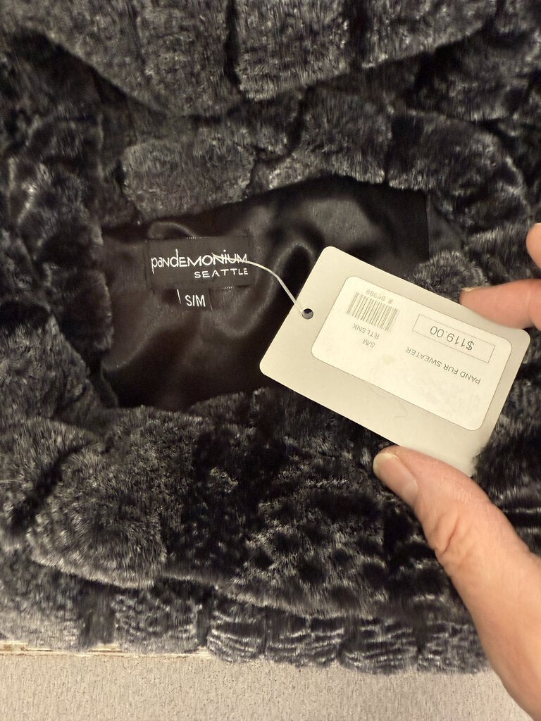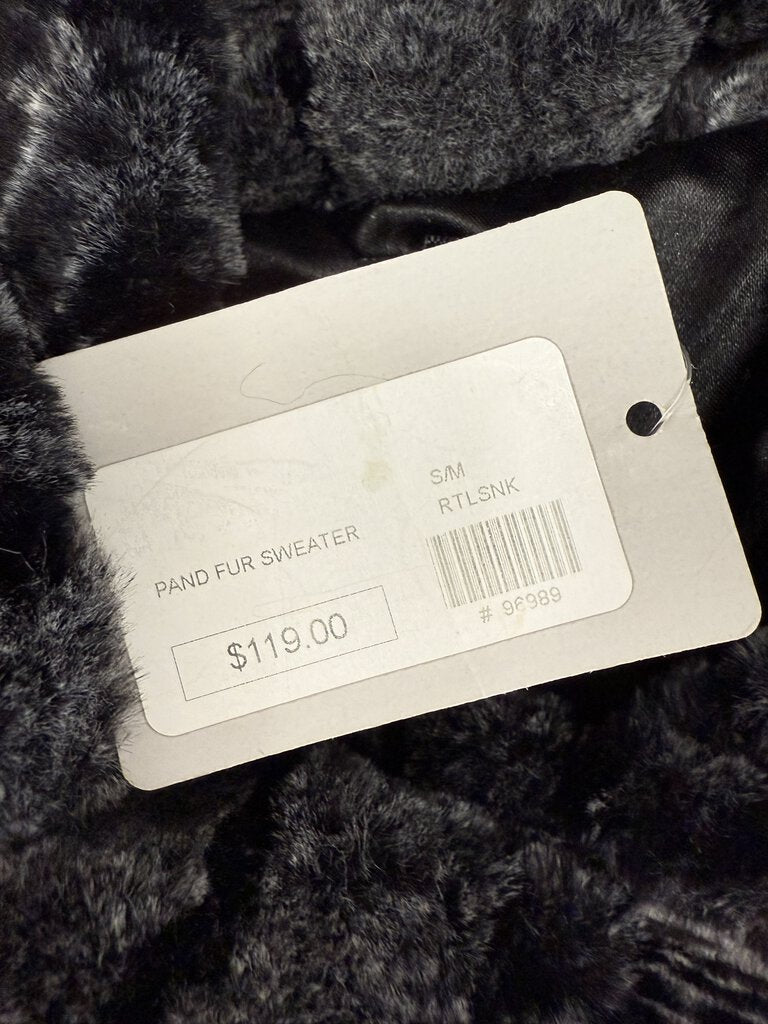 New with Tags Pandemonium Seattle Pand Faux Fur Turtleneck Sweater size small/medium. Plush velour fabric, with a heavy satin lining for warmth in a Black/Silver Gray color. Luxurious feel to the touch, sharp looking for a night out in the cold.