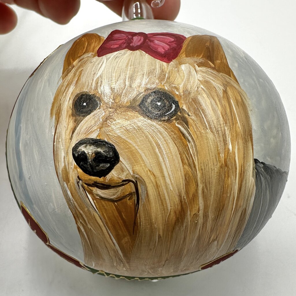 Celebrate the holidays with these charming hand painted Yorkshire Terrier Christmas bauble ornaments. Perfect for dog lovers and Yorkie fans, this set of 2 plastic baubles features adorable detailed artwork of Yorkies in festive holiday style. They are a unique addition to your tree or a thoughtful gift for a pet lover. They have a 3” diameter and are in excellent pre owned condition. Please carefully review the photos for condition details.
