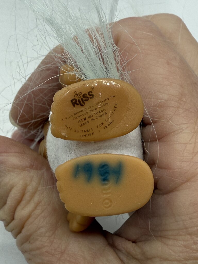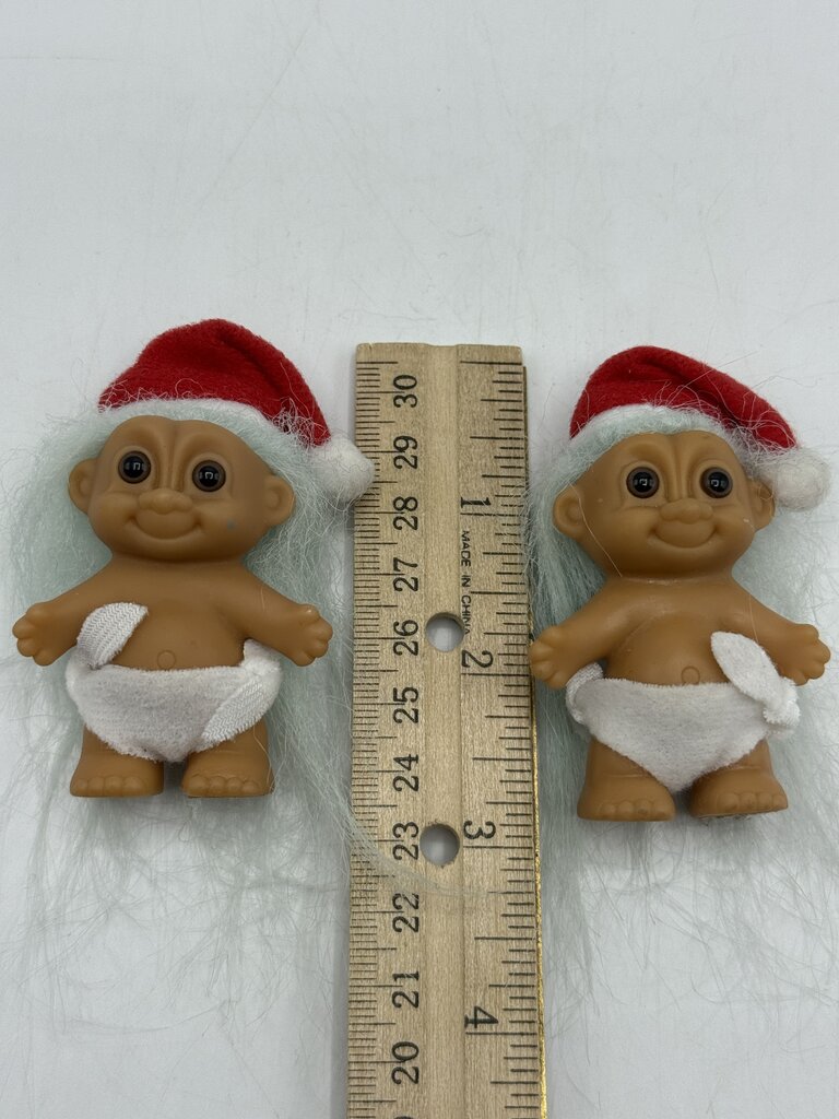 Adorable set of 2 Russ Troll Dolls Baby Santa with blue hair, diapers and a Santa Hat. The dolls measures approximately 3” tall and are in very good condition.