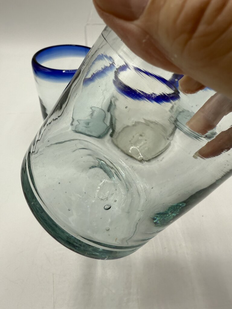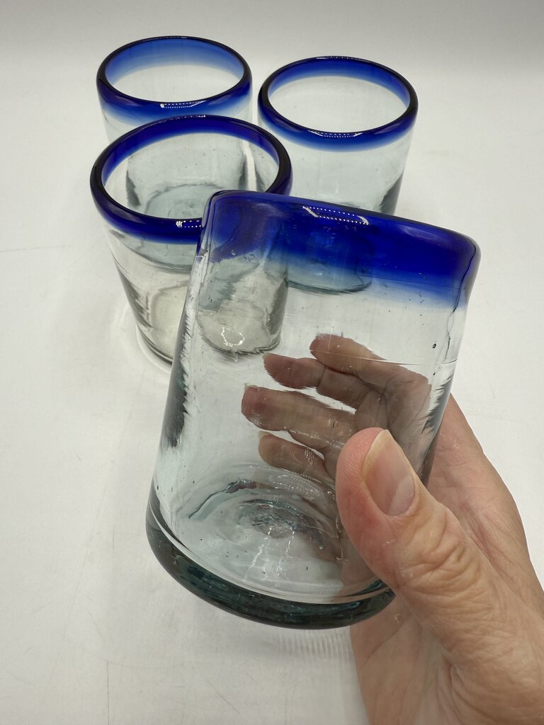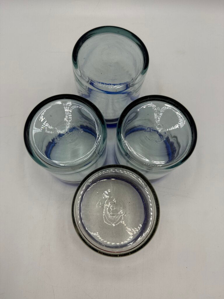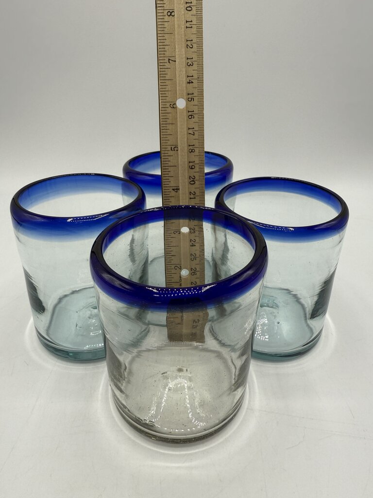 Set of 4 Hand Blown Mexican Bubble Glass 4” Blue Rim /rw