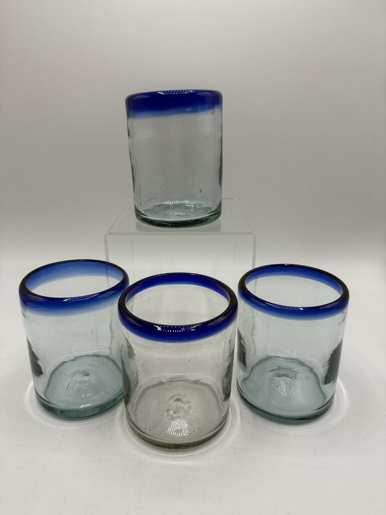 Set of 4 hand made, blown bubble glass, double rock glasses from Mexico with cobalt blue rims. Glasses measure approximately 4” tall and 3” in diameter. Glasses are not all exact in size because they are handmade. Clean, no chips, cracks or cloudiness. 10 ounce capacity.