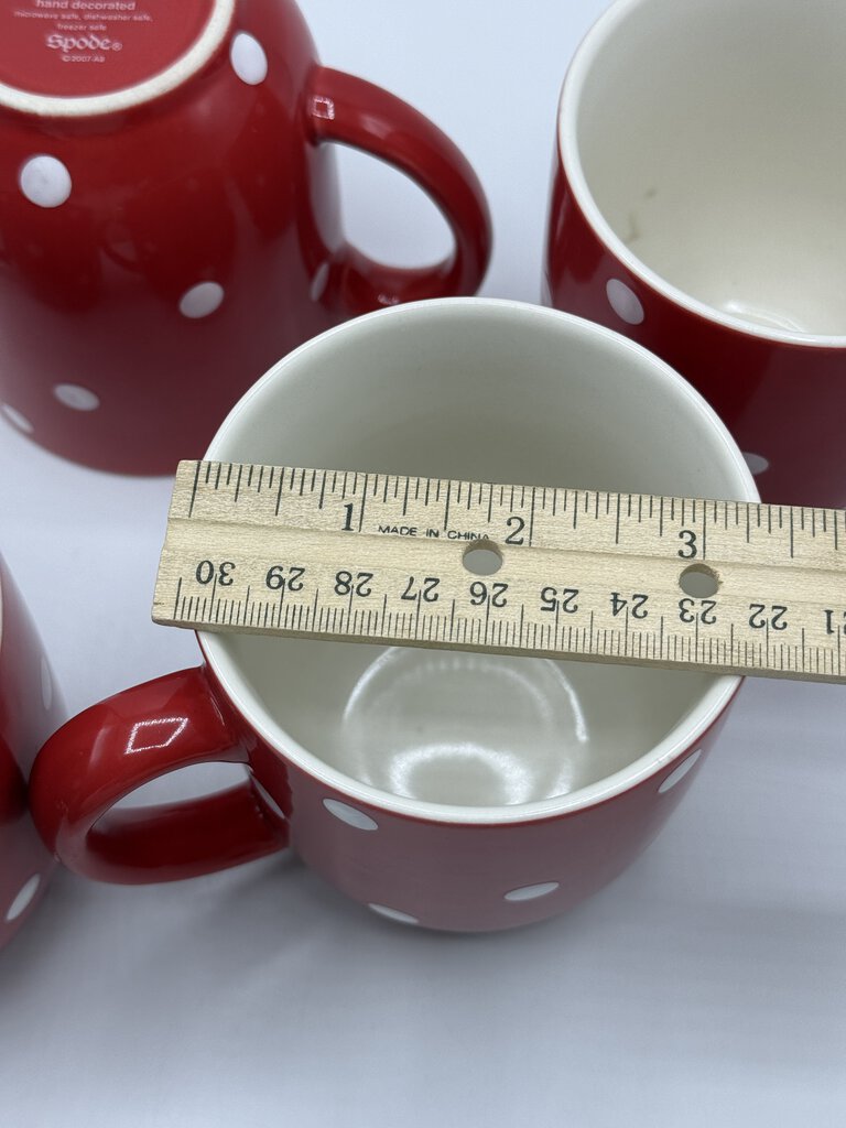 This is a Spode mug from the Baking Days collection, featuring a red and white polka dot pattern. It is perfect for adding a touch of charm to your kitchen or dining table.Mugs measures 4” tall and 3.25” in diameter. No chips or cracks.