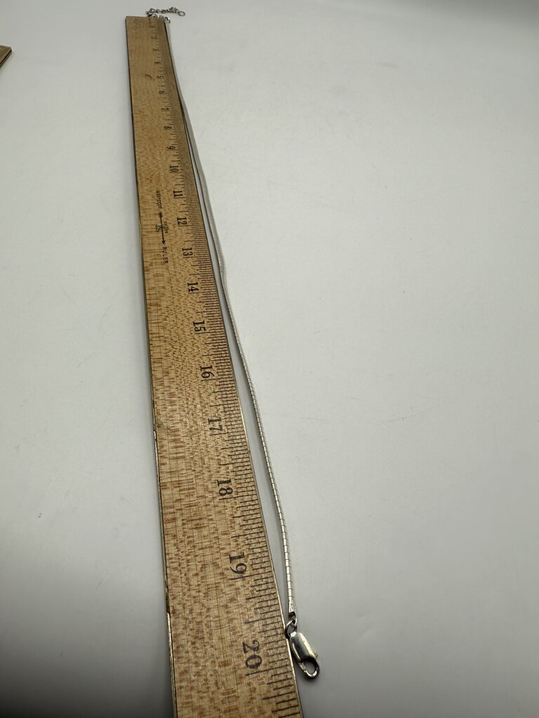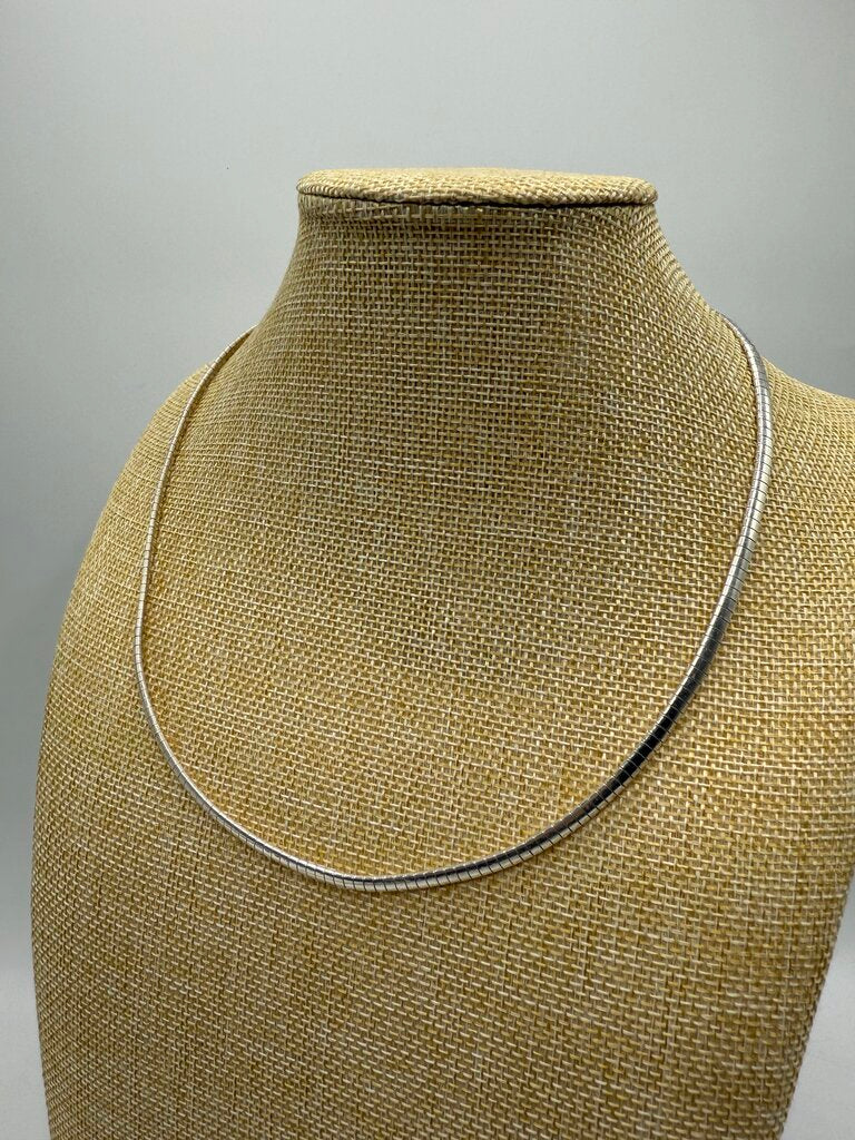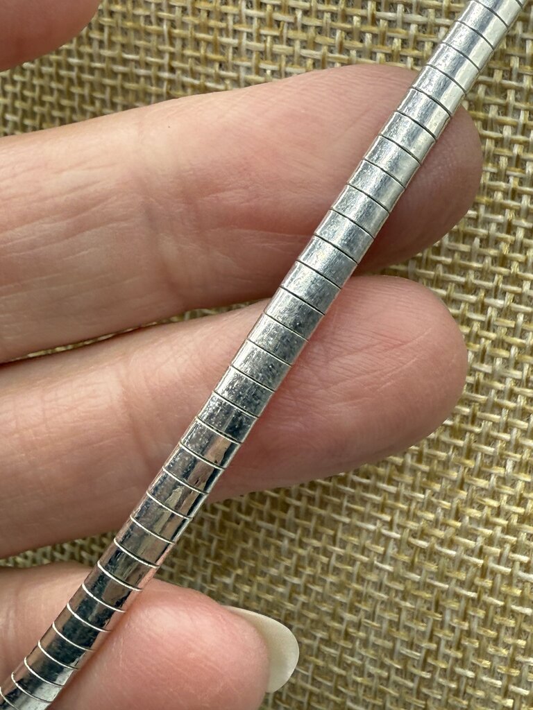 Estate necklace, Sterling Silver Omega Chain Necklace made in Italy. Necklace measures 20” long with a 2 inch extension chain, 4 mm thick and a gram weight of 20.87 grams. Lobster claw clasp. Made in Italy, hallmarked .925.