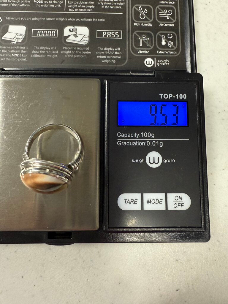 Sterling Silver Ring with a smooth and shiny, brown and White Sea shell stone. Size 9. Nice mounting that enhancing stone. No damage found. Gram weight is 9.53 grams.
