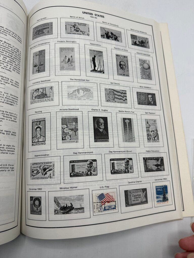 The Harris Freedom Stamp Album Unites States with stamps. Copyright 1978. Estate item, the front stamps of Flags of United States is filled and back pages, President of United States stamps are filled. Some other pages have stamps too. Good condition on soft cover album. No rips, tears, stains or odors. Plus the United States of America Bicentennial Collection of 5 stamps, vintage tweezers and plastic magnifying glass.
