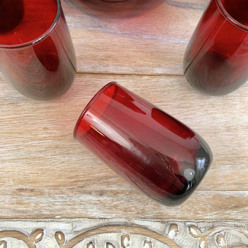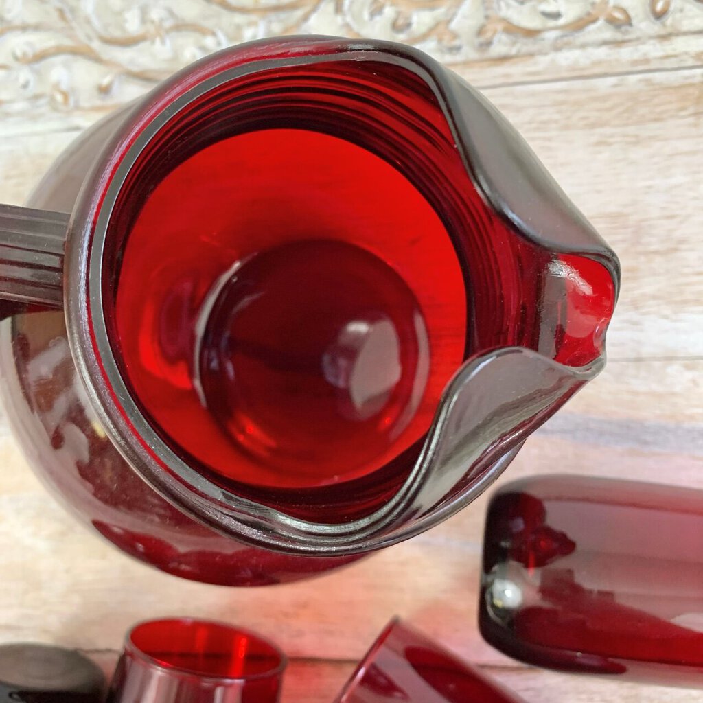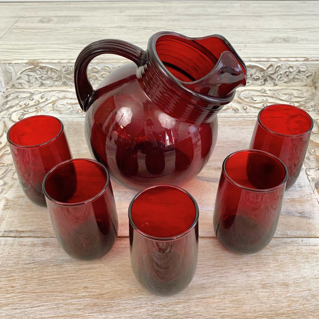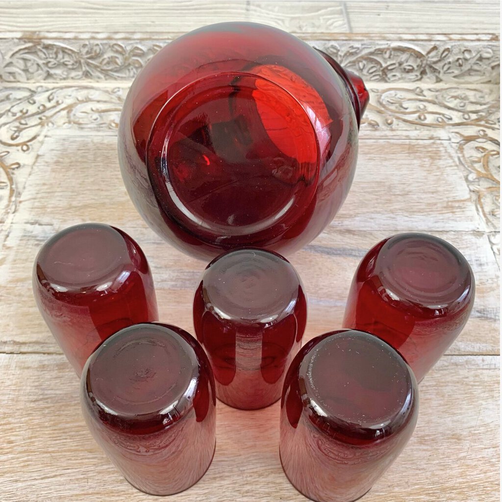 Vintage Anchor Hocking Royal Ruby Slant Pitcher and Roly Poly 4 oz. Juice Tumblers Set/6. Vivid deep red color to the is vintage ruby red glass pitcher set made by Anchor Hocking from 1938-1967, and again in 1973-1977. The pitcher is their Deco slant style, and the Roly Poly tumblers are 4 oz juice tumblers. The set was estate-owned and is in excellent condition. No chips or cracks found. The pitcher measures approx. 6” in height (at its tallest point) and approx. 5” in diameter. Spout to handle measures 6 1/2”. The tumblers measure 3 3/8” in height and 2” in diameter. Please carefully review the photos and feel free to ask questions.