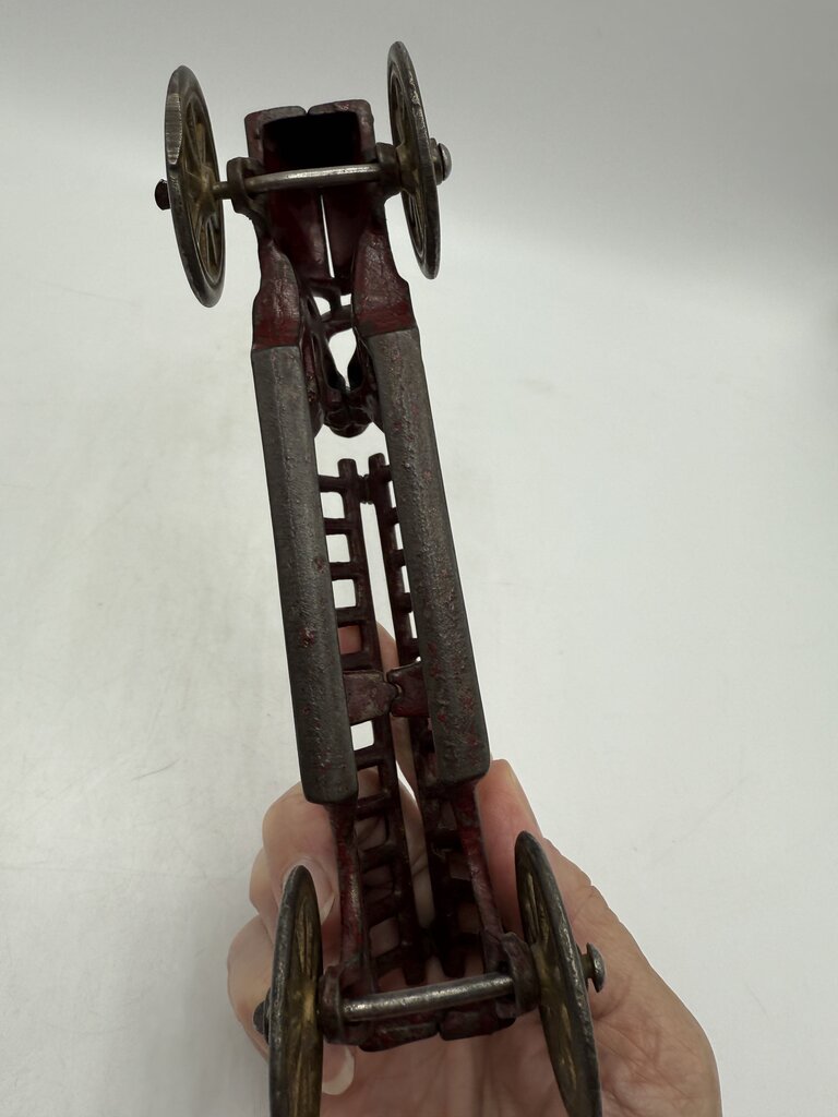 Antique cast iron toy firetruck with driver measures 7.5” long by 3” tall and 2” wide. Great patina of wear on original red paint. The wheels still roll.