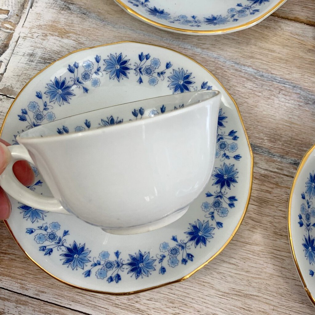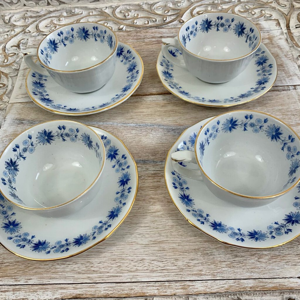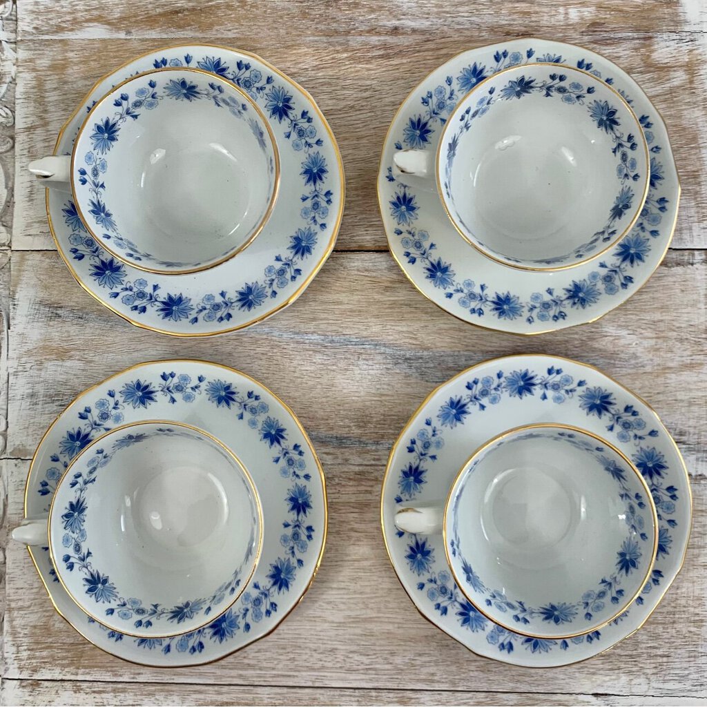 Vintage Arabia of Finland Blue Flower Teacups and Saucers Set/4, Mid-Century Scandinavian /cb
