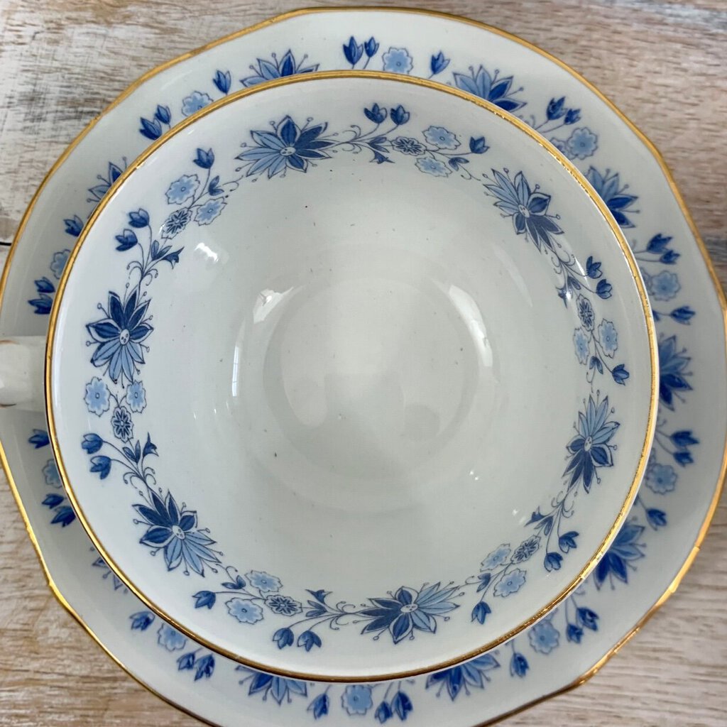 The Scandinavian vibes are strong with these four adorable teacup and saucer sets made by Arabia of Finland, likely in the 1960s. They feature a pretty blue floral pattern and gold rims. It would be charming to mix and match these cuties with other china patterns. The set was estate-owned and is in good vintage condition. You might feel a couple of very minor flea bite chips along the edge on a couple of saucers. I couldn’t get a good photograph of the flea bites, as they are very minimal. The teacups measure 1 7/8” in height and 3 1/4” in diameter. Please carefully review the photos for condition details.