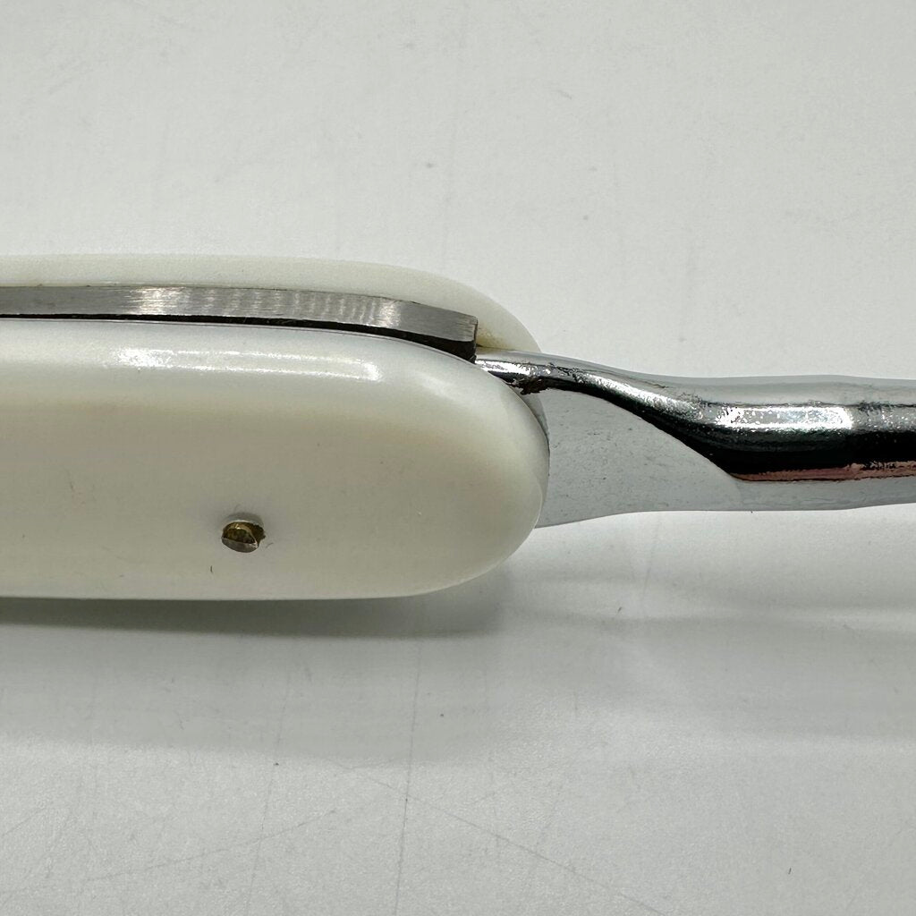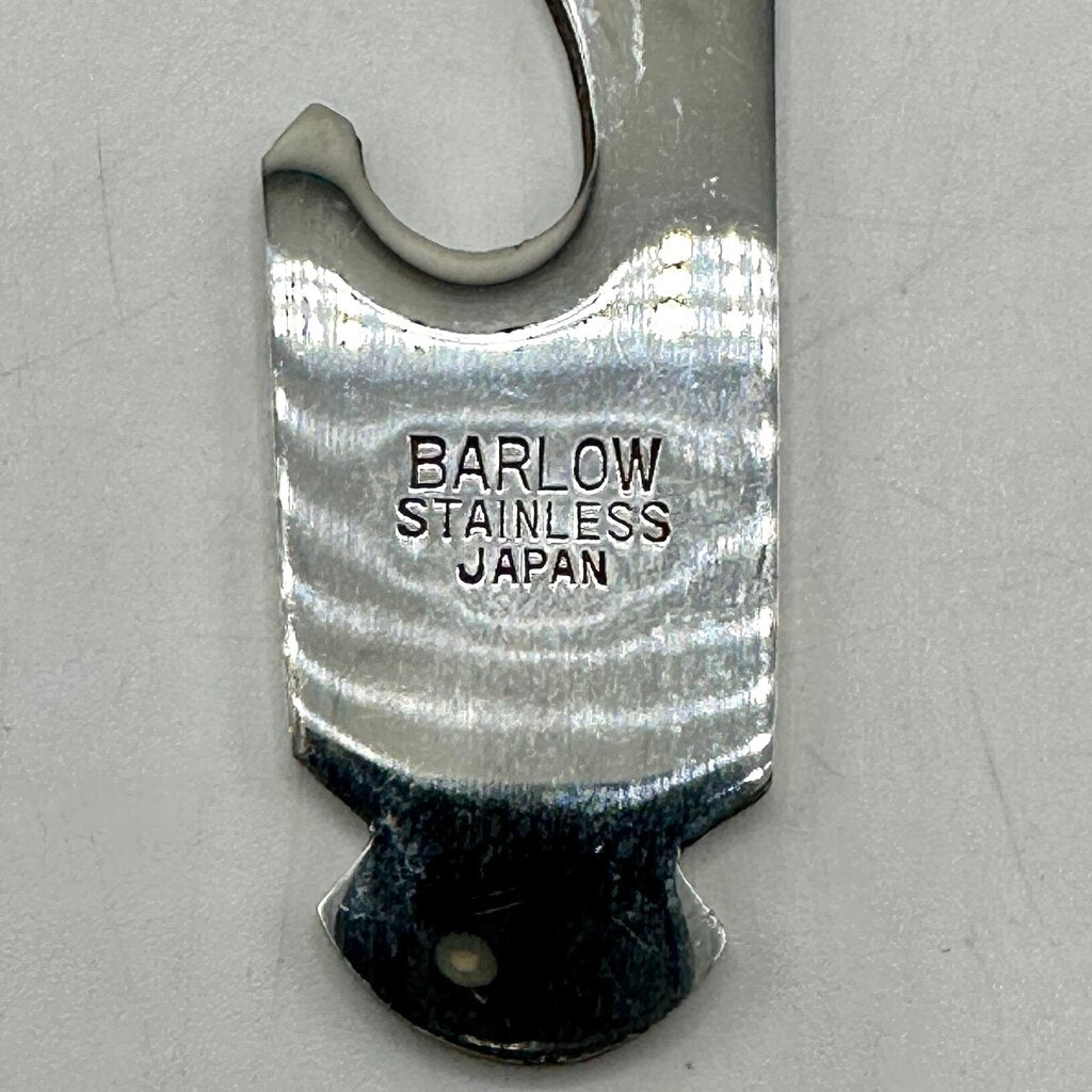 Vintage Barlow Japan 7-piece stainless steel multi-tool pocket knife kit in original case. Perfect for camping, fishing or tossing in your glove box for everyday tasks. Includes a white handle with a Phillips screw driver (3 3/4”), a bottle opener (3 1/2”), a hammer (3 1/2”), a file (3 3/4”), a flat head screwdriver (3 1/4”), a serrated blade (4 1/4”) and a straight edge blade (4 1/8”). The case measures 4 3/4”x 5 1/2”. Everything is in very good vintage condition with light age and use appropriate wear. The tools fit securely into the handle. Please carefully review the photos for condition details.