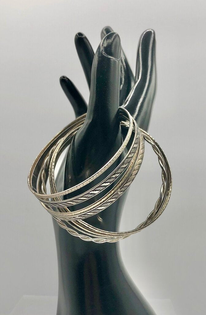 Great vintage fashion to enhance that summer vibe or Bohemian style. This lot of 8 bangles are all silver toned with a few assorted textures.