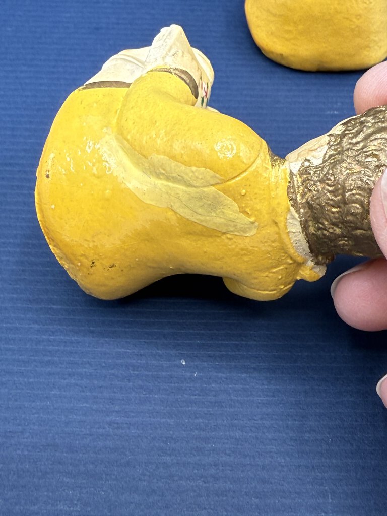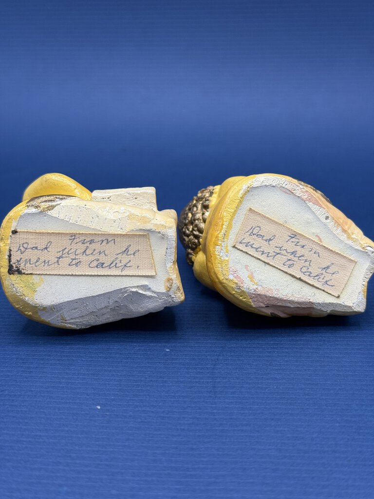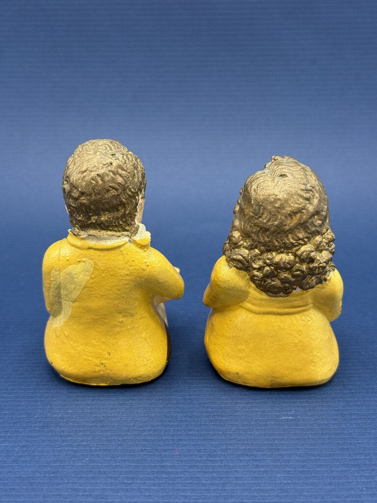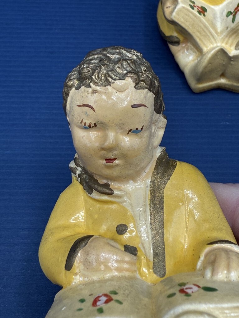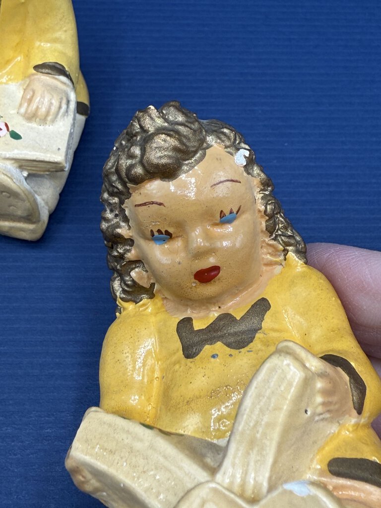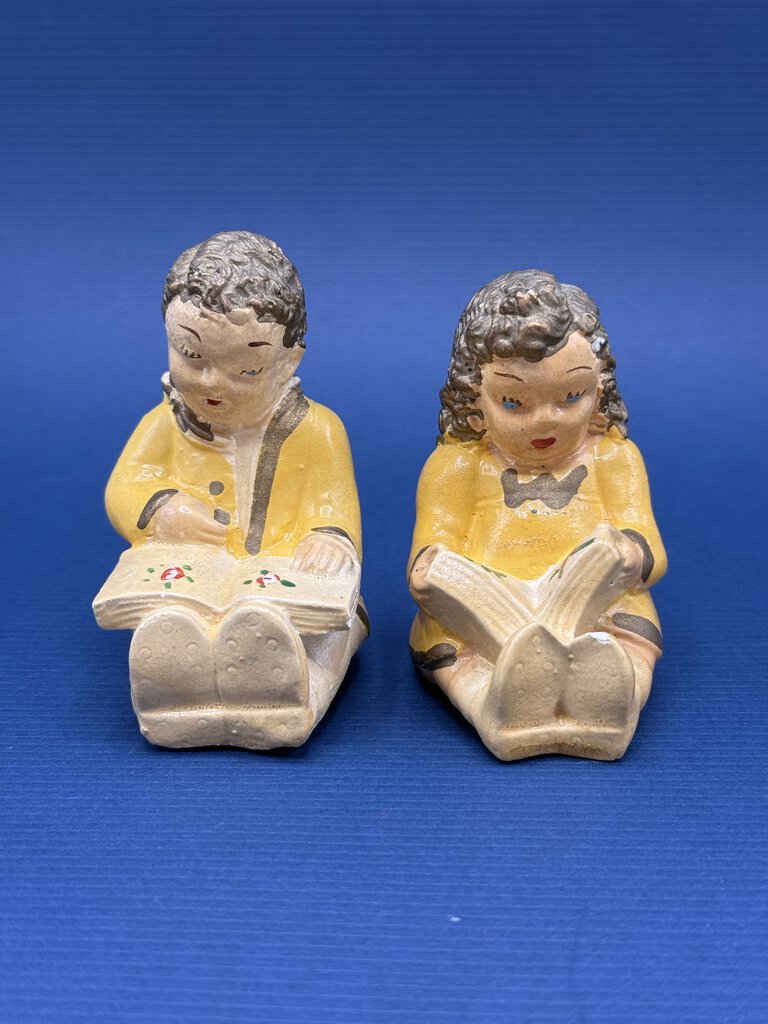 Vintage set of chalkware figurines, seated little boy and little girl reading books. Handpainted, yellow clothing with flowers on book pages. Measures approximately 3” tall with a 2” x 1” base.