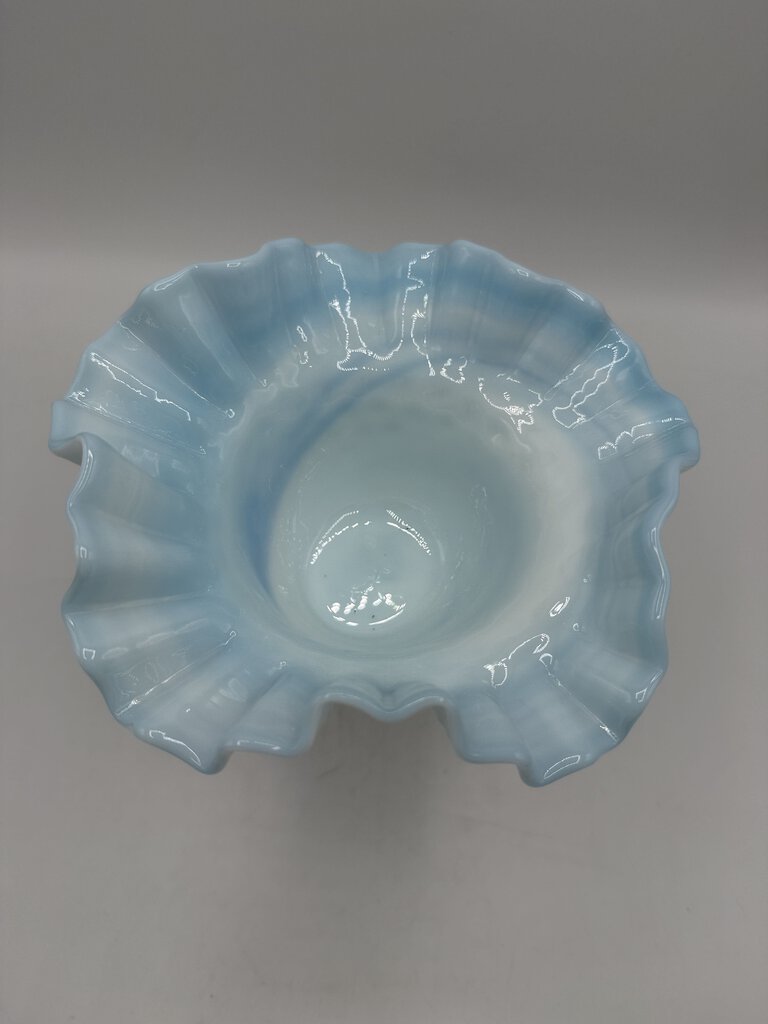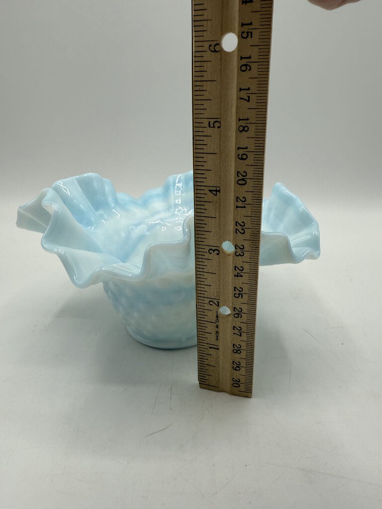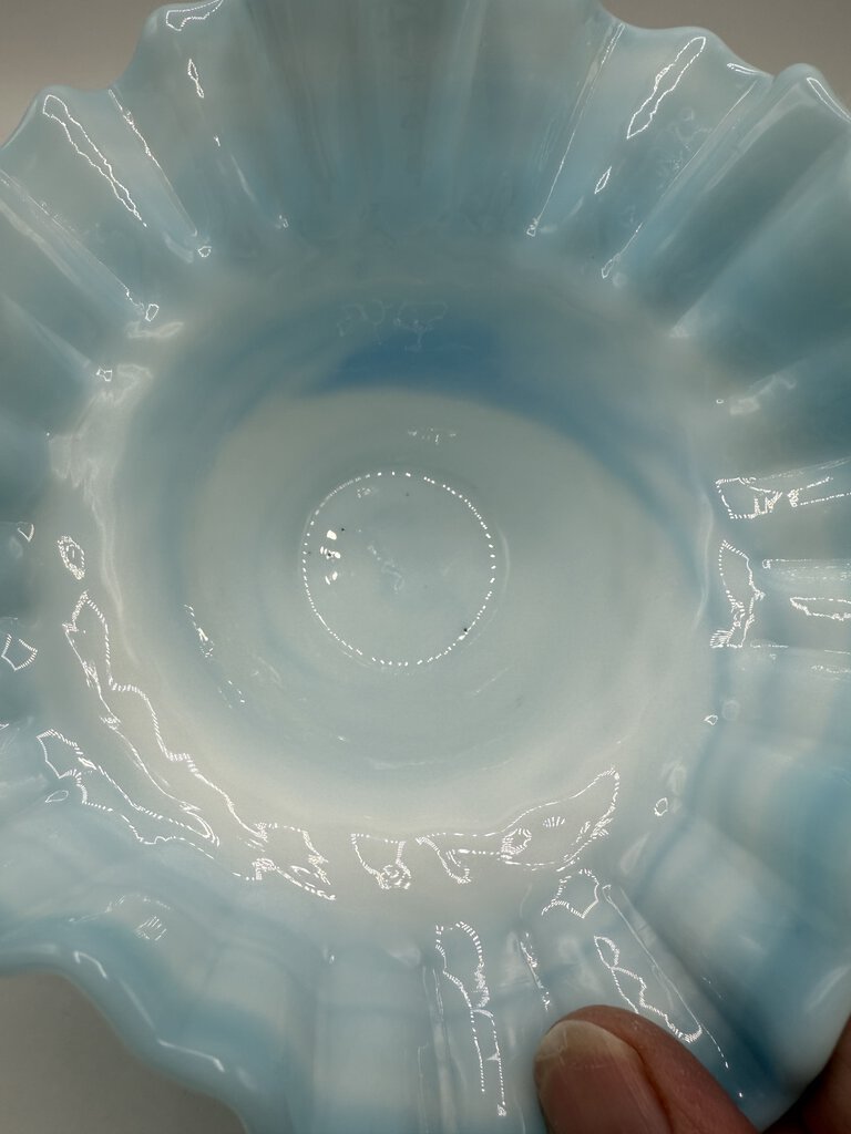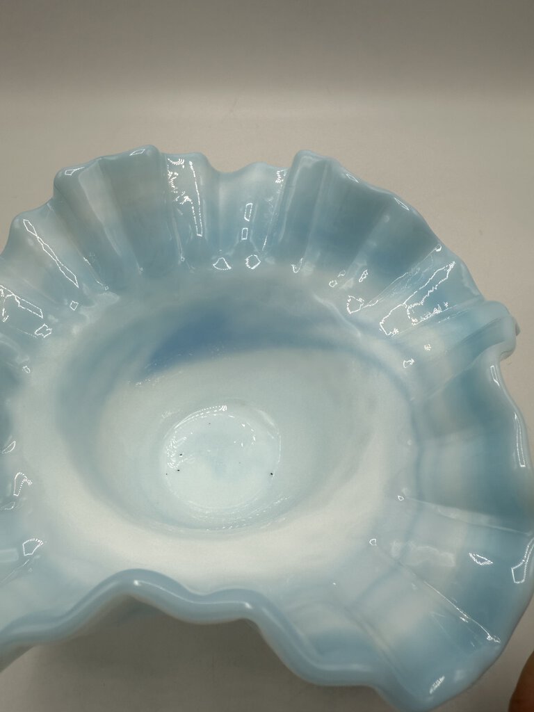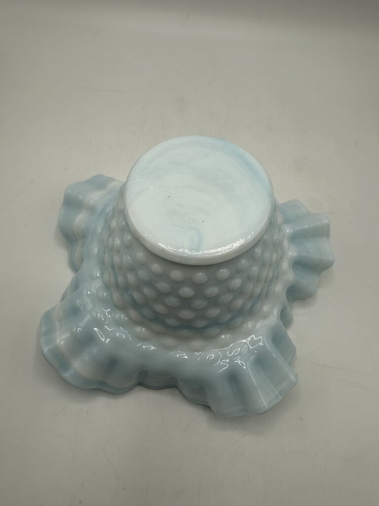 Unique Blue and White swirl dish design by Fenton glass. Hobnail milk glass with soft shades of blue, crimped ruffled edge. Measures 6.5” in diameter by 3.25” tall. No chips or cracks, 3 small dark dots in bottom of dish from manufacturing.