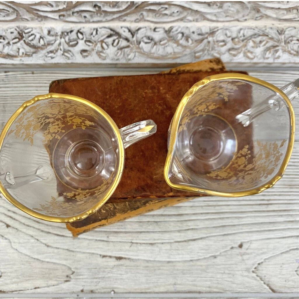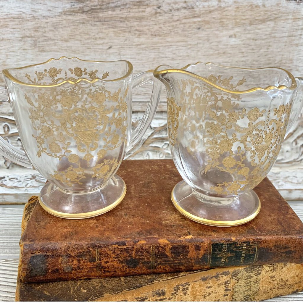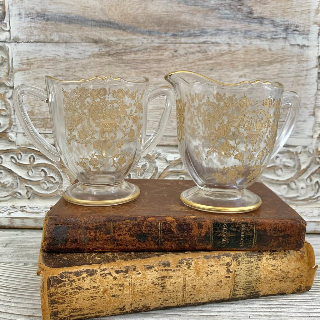 Vintage romance abounds on this beautiful sugar and creamer set made by Glastonbury-Lotus between the 1930s-1940s. The pieces are trimmed in gold gilding and the ornate Rosebud etch is filled in with gold as well. Charming pieces for tea or coffee service!