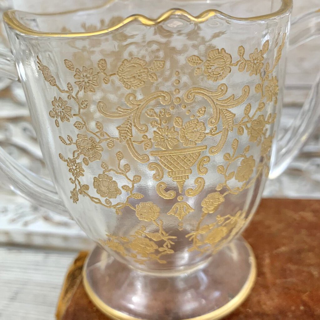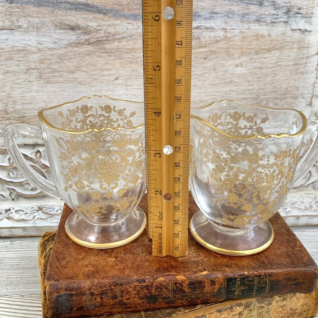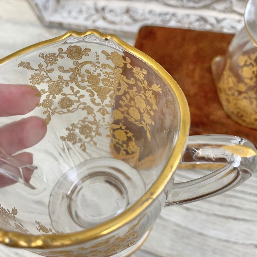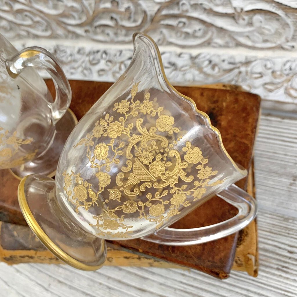 Vintage romance abounds on this beautiful sugar and creamer set made by Glastonbury-Lotus between the 1930s-1940s. The pieces are trimmed in gold gilding and the ornate Rosebud etch is filled in with gold as well. Charming pieces for tea or coffee service!