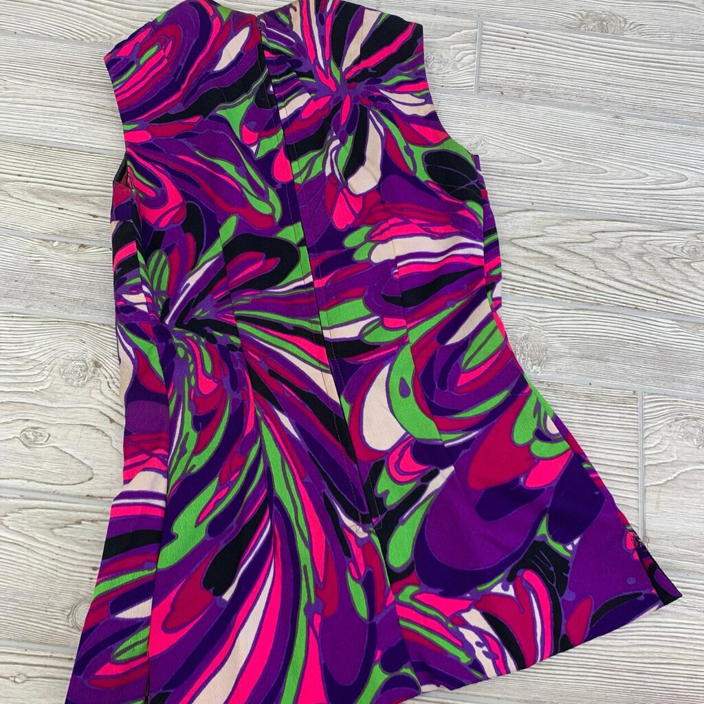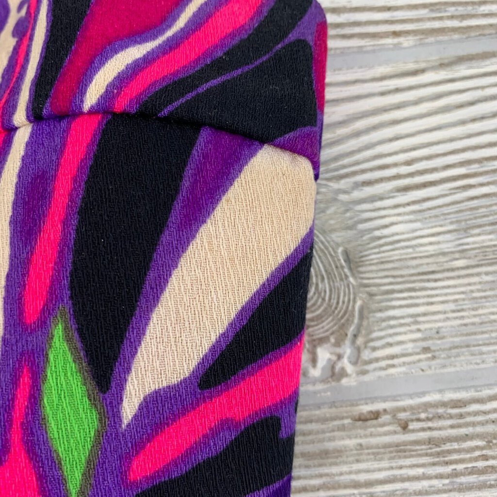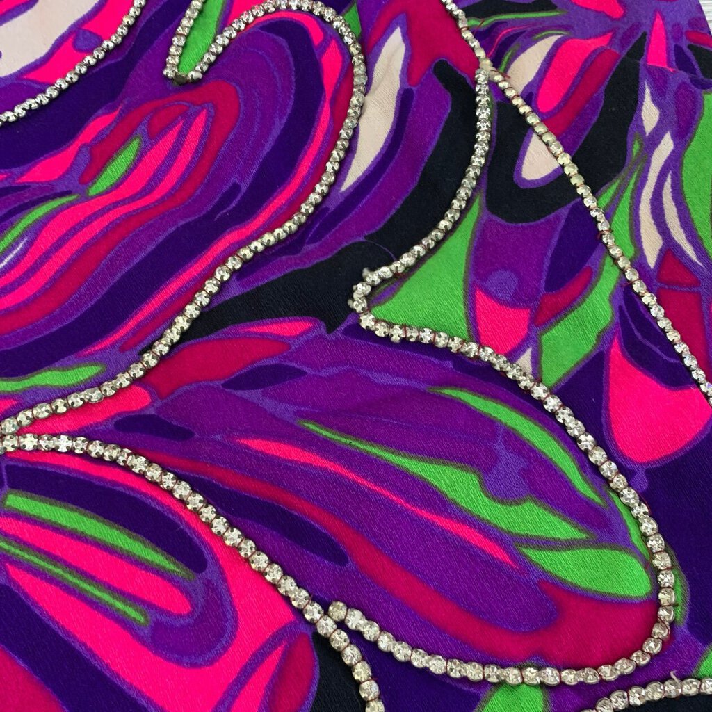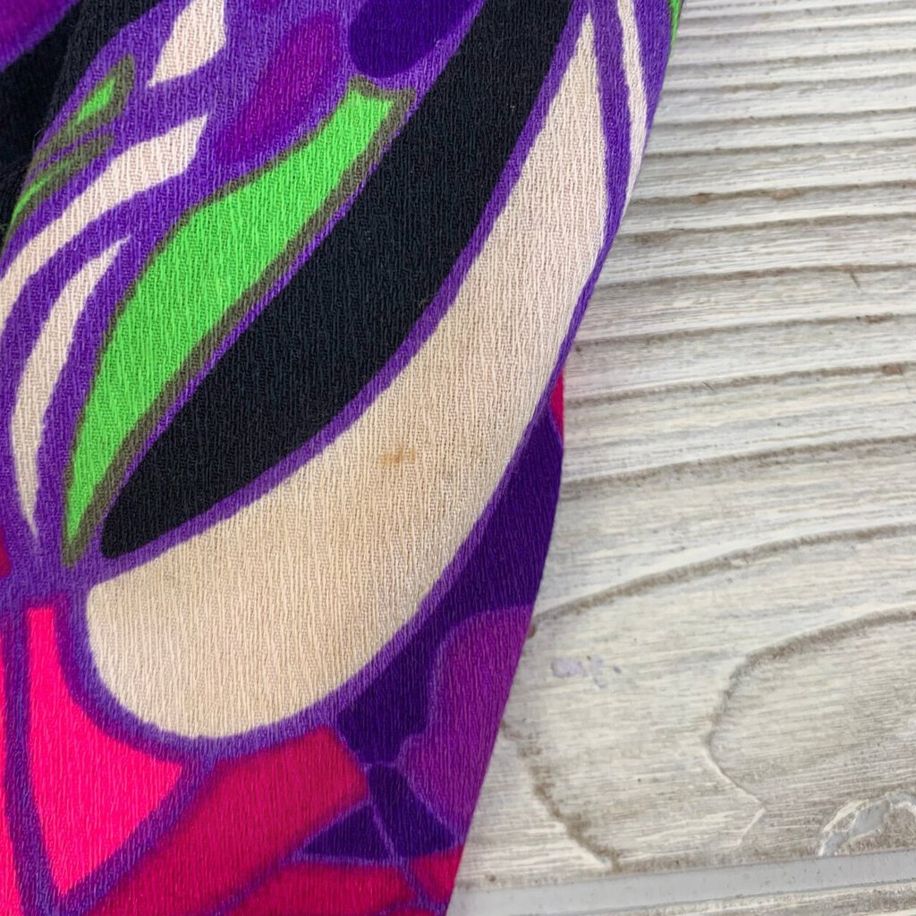 Fun bold psychedelic print on this longer top or tunic, handmade in the 1960s! It features a large Pucci-esque floral print in tones of purple, pink, black, and green, outlined by strands of rhinestone trim. The tunic was estate-owned and is in good vintage condition. The only issues found were that one of the rhinestone trim pieces has lost a couple of stitches and needs to be sewn back down and there are subtle spots of discoloration on the lighter areas. Take a close look at the pictures for further condition reference. Measurements: Bust: 17” Pit to pit laid flat Waist: 14 1/2” Laid flat Hips: 17” Laid flat Length: 28” From top of shoulder to hem.