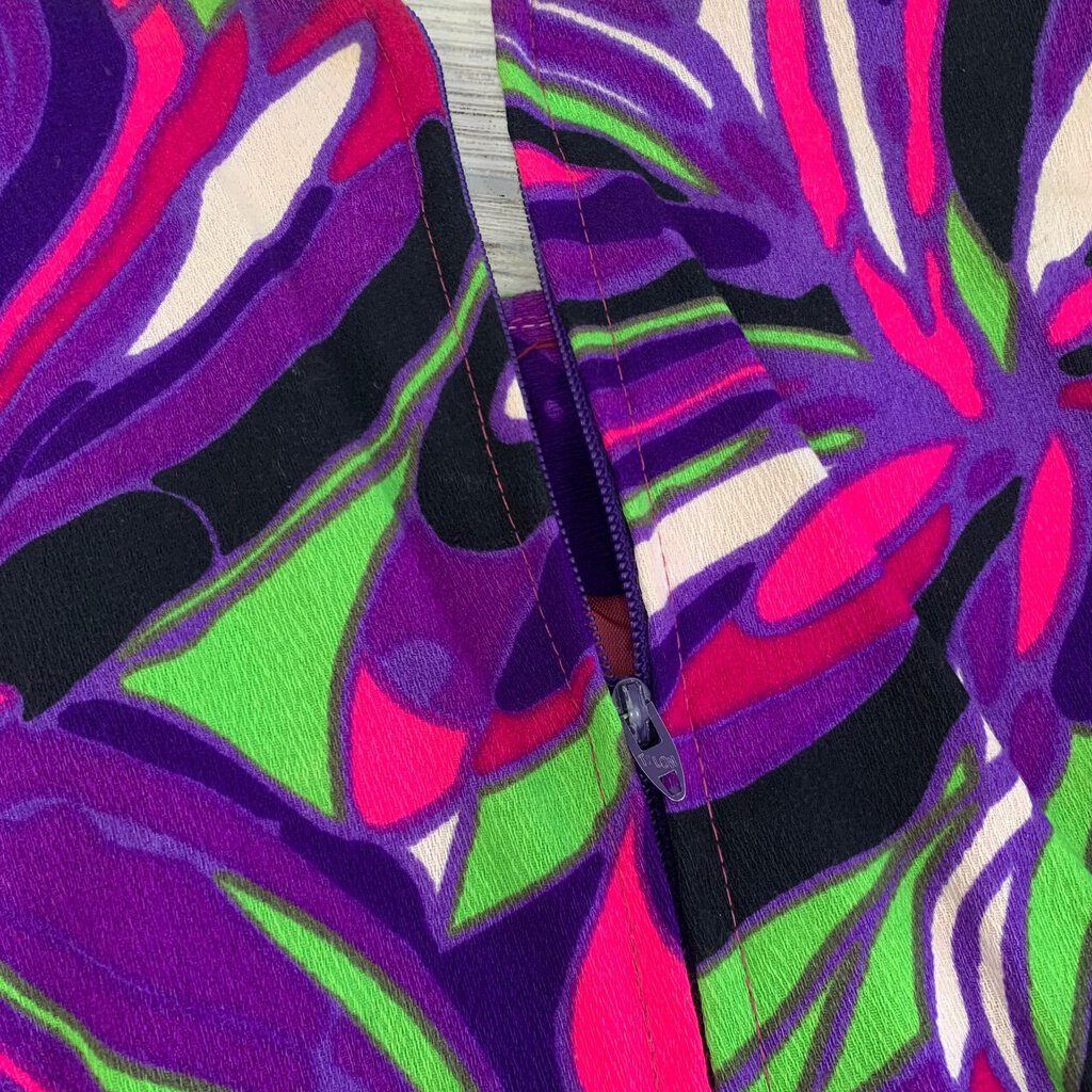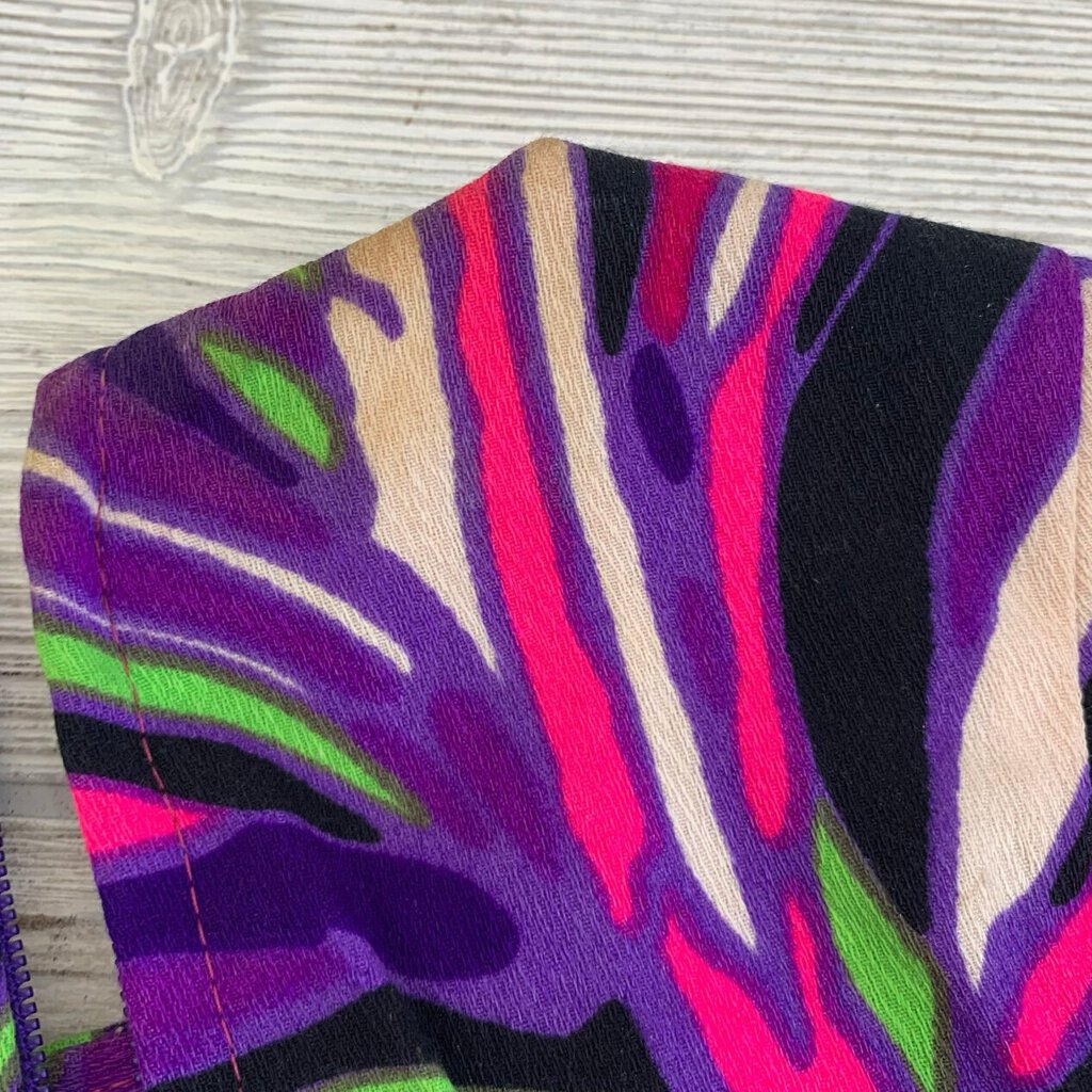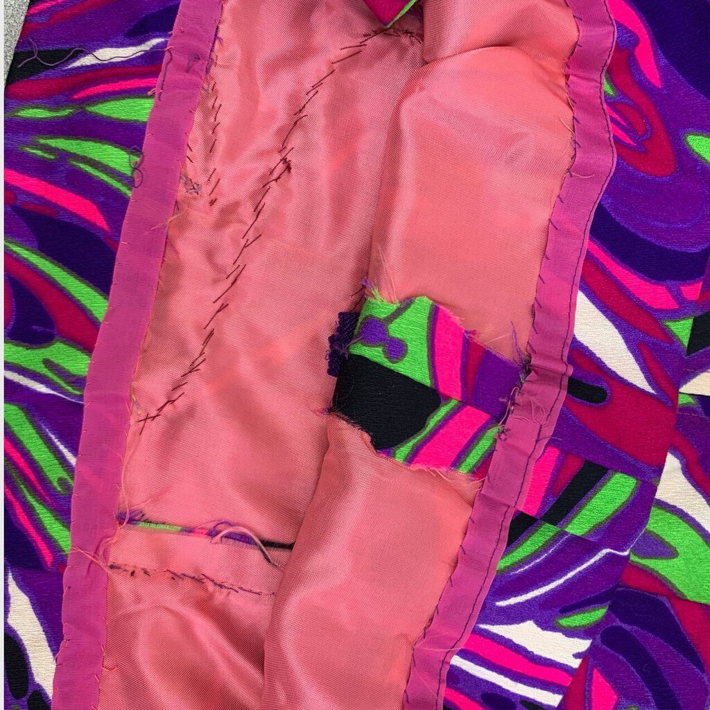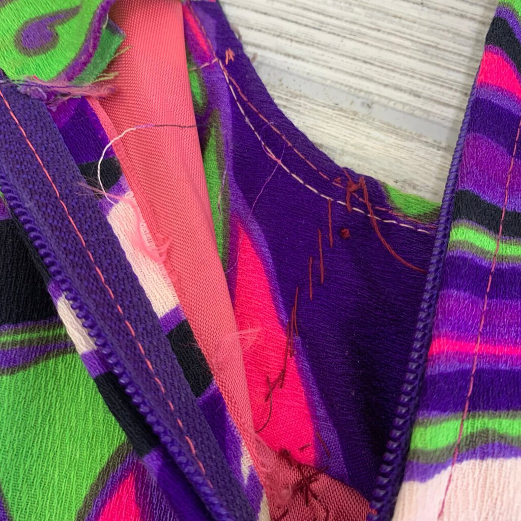 Fun bold psychedelic print on this longer top or tunic, handmade in the 1960s! It features a large Pucci-esque floral print in tones of purple, pink, black, and green, outlined by strands of rhinestone trim. The tunic was estate-owned and is in good vintage condition. The only issues found were that one of the rhinestone trim pieces has lost a couple of stitches and needs to be sewn back down and there are subtle spots of discoloration on the lighter areas. Take a close look at the pictures for further condition reference. Measurements: Bust: 17” Pit to pit laid flat Waist: 14 1/2” Laid flat Hips: 17” Laid flat Length: 28” From top of shoulder to hem.
