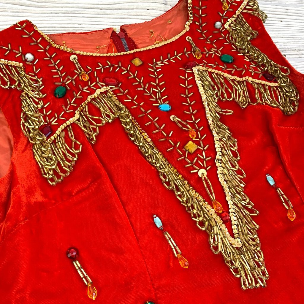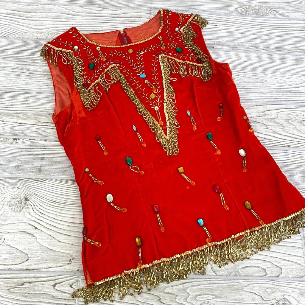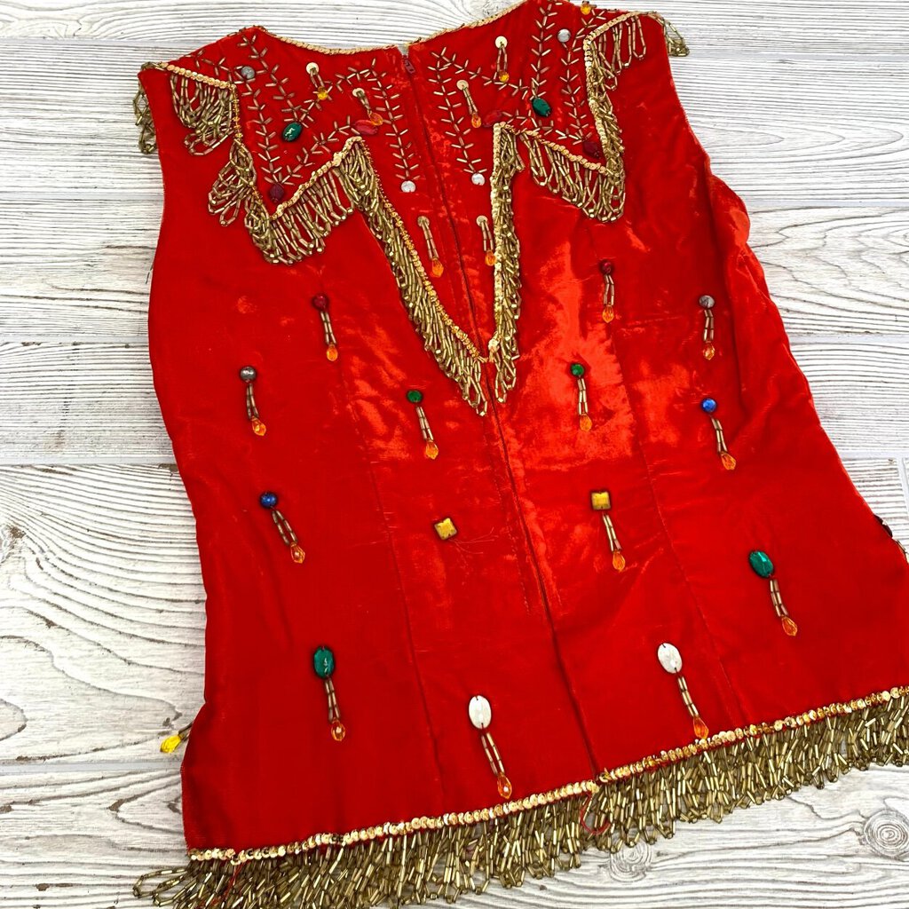 Stunning beadwork on this flashy little number likely made in the 1950s or 60s. I believe this top was part of a handmade majorette’s uniform but it no longer has the short shorts. Now it’s got a life all of its own as a fancy evening out sort of top! Would also be great for modern circus attire or other performance costuming! The top was estate-owned and was carefully stored for many years. It’s in good vintage condtion, showing only a few impressions in the velvet, a subtle spot, and a few beads missing. Look closely at the pictures for further condition reference. Measurements: Shoulders: 14”, Bust: 17” Pit-to-pit laid flat, Waist: 14 1/2” Laid flat, Length 21”,
