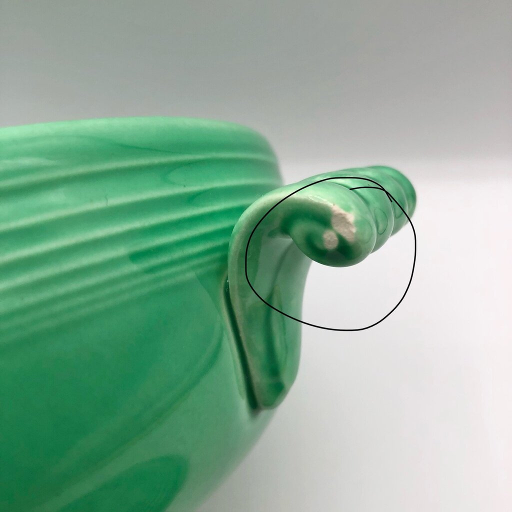 There is a chip on the lid, a chip on one scrolled handle and a glaze skip on the bowl rim, all pictured in listing.