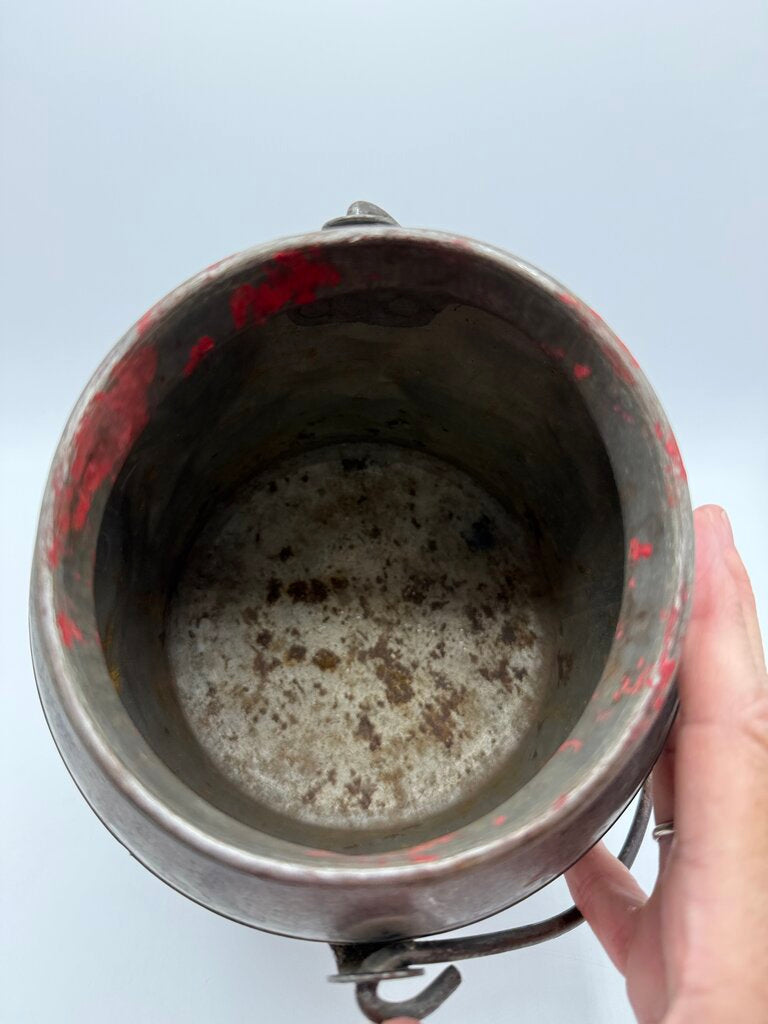 Vintage metal milk jug with handle. Great farmhouse decor. Marked on side LIQ 4 Qt.. Some dents in side from use. No holes in bottom. Measures 9” tall, not including handle, 5” in diameter opening and 7” in diameter base. Nice patina of worn red paint too.