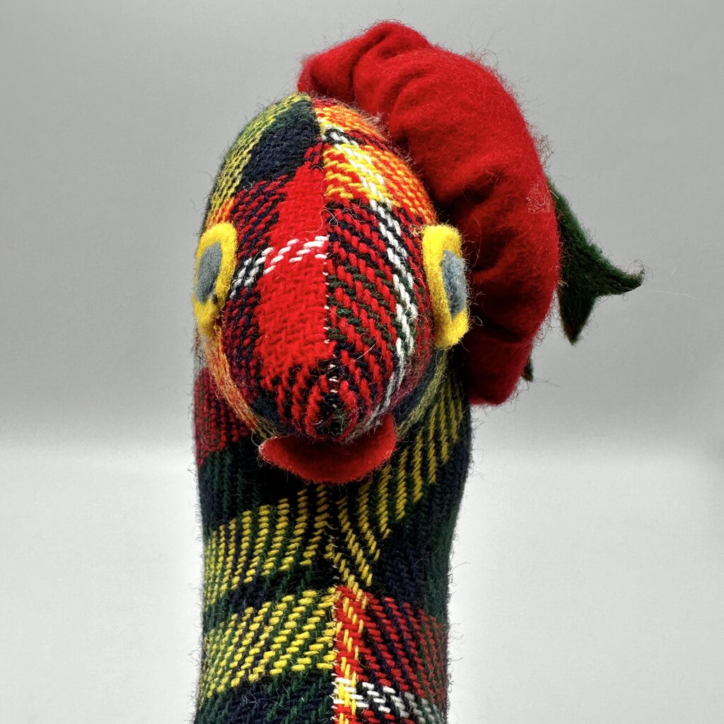 Charming, one-of-a-kind Nessie wool plaid Loch Ness monster plush toy. Handmade in Scotland by Laura Grant. It is missing the "PLEASE LOOK AFTER NESSIE" tag. Nessie is about 14 1/4” long and 8 1/2” tall. In very good vintage condition, it is a little dusty but there are no tears, holes or musty odors. The felt appliqués on the hat and the tongue would benefit from a few drops of glue. Please carefully review the photos for condition details.